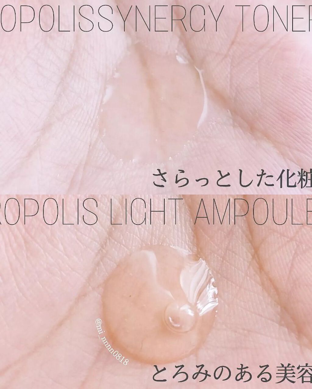 プロポリスエキスがトナー・・72.6% アンプル・・83%だそうです。 香りはほぼないです。めっちゃ使いやすい。 トナーはどっちかというとシャバシャバ系のテクスチャー。 特に化粧水はストック買いしたいと思うほどに気に入った💞