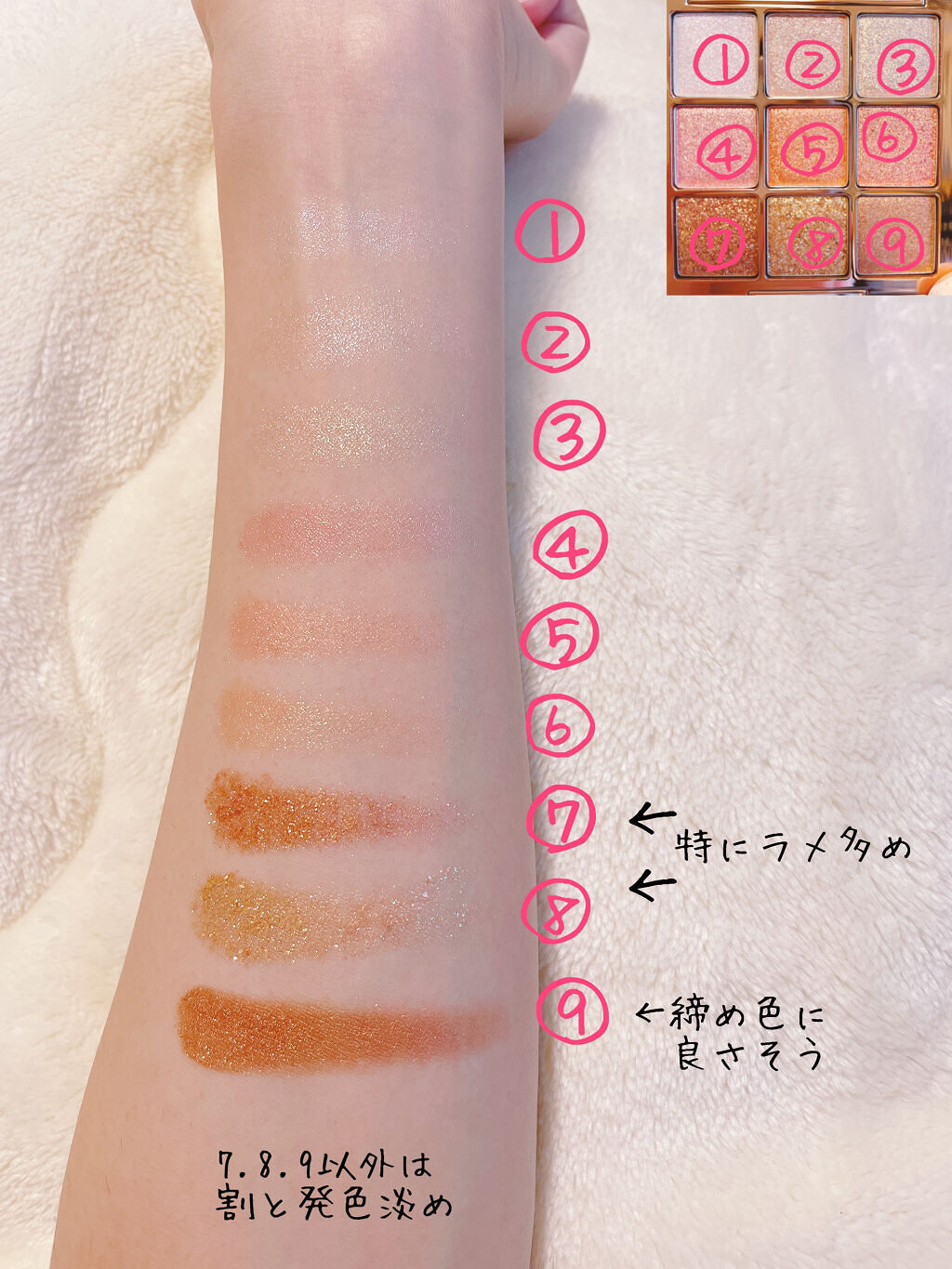 見た目が可愛い💗 持っててテンションが上がる! パレットの蓋の裏が全面ミラーになっているので便利 これ一つでアイメイク、チーク、ハイライトが完結! 色んなパターンのメイクができる マットとラメ両方あるので使いやすい ハイライトカラーが2色あるので、混ぜたりしてちょうど良いハイライトが作れる パレット上では粉飛びするけど目にのせるとしっかり定着する(大粒ラメは少し飛ぶ) 発色がよい パレットが大きめなので嵩張る ブラシやチップが内蔵されてないので別でブラシ必須(個人的には指よりブラシ推奨) パレット上で結構粉飛びする(汚れやすい) 大粒ラメは少しラメ飛びする