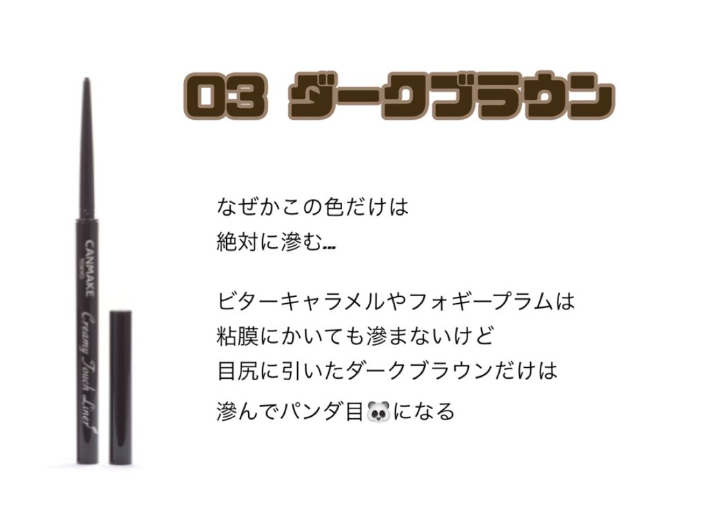 スルスルかけて滲まないし安いし クリーミータッチライナーは私にとって必需品です! 特に03のダークブラウンはストックが無いとイヤ。 久々に05も買ったけど普段は02も使用。