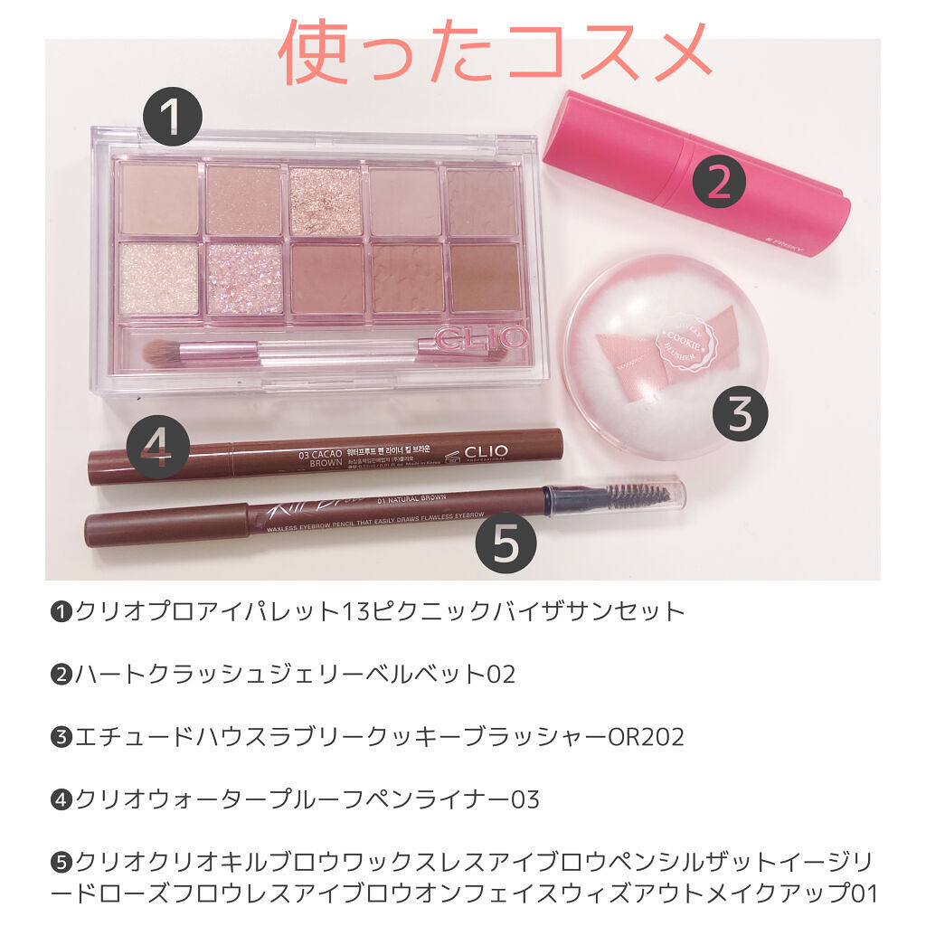 メイクのやり方写真の通りにやれば出来るのでポイントを紹介! アイシャドウはオレンジ系でグラデーション アイライナーは細め長めで最後だけはね上げると韓国っぽくなる&盛れる 下まぶたの端にラインを引いて(アイシャドウでも薄いアイライナーでも⚪︎)繋げない 涙袋は、中央だけ濃くしてぼかす。(ハイライト部分にコンシーラーを乗せるとより⚪︎) ラメは乗せ過ぎないように乗せる! チークは面長さんは横長、丸顔さんは斜めに入れると盛れます! リップはグラデーションに。マットの方が韓ドルっぽいけどグロスを重ねてツヤにしても可愛い!
