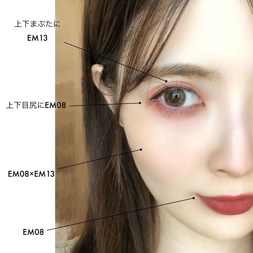- <EM-J01 ピンクミスト> ジメチコン、ジメチコンクロスポリマー、トリベヘニン、リンゴ酸ジイソステアリル、(ビニルジメチコン/メチコンシルセスキオキサン)クロスポリマー、酸化チタン、セチルPEG/PPG-10/1ジメチコン、イソステアリン酸ソルビタン、(VP/ヘキサデセン)コポリマー、トリイソステアリン酸ポリグリセリル-2、ジイソステアリン酸ポリグリセリル-2、赤230(1)、赤202、黄4、香料、デヒドロ酢酸、酸化鉄 <EM-J02 ベルベットムード > ジメチコン、ジメチコンクロスポリマー、トリベヘニン、リンゴ酸ジイソステアリル、酸化チタン、(ビニルジメチコン/メチコンシルセスキオキサン)クロスポリマー、セチルPEG/PPG-10/1ジメチコン、イソステアリン酸ソルビタン、(VP/ヘキサデセン)コポリマー、トリイソステアリン酸ポリグリセリル-2、酸化鉄、赤202、ジイソステアリン酸ポリグリセリル-2香料、ジメチルシリル化シリカ、デヒドロ酢酸、黄4、黄5 <EM01 ポップスターブリック> ジメチコン、ジメチコンクロスポリマー、トリベヘニン、トリイソステアリン酸ポリグリセリル-2、酸化鉄、(ビニルジメチコン/メチコンシルセスキオキサン)クロスポリマー、セチルPEG/PPG-10/1ジメチコン、イソステアリン酸ソルビタン、(VP/ヘキサデセン)コポリマー、黄5、リンゴ酸ジイソステアリル、赤202、ジイソステアリン酸ポリグリセリル-2、香料、デヒドロ酢酸、水添ロジン酸メチル <EM03 モデルテラコッタ> ジメチコン、ジメチコンクロスポリマー、トリイソステアリン酸ポリグリセリル-2、トリベヘニン、黄4、酸化鉄、(ビニルジメチコン/メチコンシルセスキオキサン)クロスポリマー、セチルジメチコンコポリオール、イソステアリン酸ソルビタン、(VP/ヘキサデセン)コポリマー、リンゴ酸ジイソステアリル、香料、デヒドロ酢酸、水添ロジン酸メチル <EM05 美人シナモン> ジメチコン、ジメチコンクロスポリマー、トリベヘニン、リンゴ酸ジイソステアリル、酸化チタン、酸化鉄、トリイソステアリン酸ポリグリセリル-2、(ビニルジメチコン/メチコンシルセスキオキサン)クロスポリマー、セチルジメチコンコポリオール、イソステアリン酸ソルビタン、(VP/ヘキサデセン)コポリマー、香料、赤202、ジイソステアリン酸ポリグリセリル-2、デヒドロ酢酸、水添ロジン酸メチル <EM07 ファッショニスタココア> ジメチコン、ジメチコンクロスポリマー、トリイソステアリン酸ポリグリセリル-2、トリベヘニン、赤227、(ビニルジメチコン/メチコンシルセスキオキサン)クロスポリマー、酸化鉄、セチルジメチコンコポリオール、イソステアリン酸ソルビタン、(VP/ヘキサデセン)コポリマー、黄5、リンゴ酸ジイソステアリル、香料、デヒドロ酢酸、水添ロジン酸メチル <EM08 インフルエンサーモカ> ジメチコン、ジメチコンクロスポリマー、トリベヘニン、トリイソステアリン酸ポリグリセリル-2、(ビニルジメチコン/メチコンシルセスキオキサン)クロスポリマー、リンゴ酸ジイソステアリル、酸化鉄、酸化チタン、セチルジメチコンコポリオール、イソステアリン酸ソルビタン、(VP/ヘキサデセン)コポリマー、黄5、赤202、ジイソステアリン酸ポリグリセリル-2、香料、デヒドロ酢酸、水添ロジン酸メチル <EM09 セレブブラウン> ジメチコン、ジメチコンクロスポリマー、トリベヘニン、リンゴ酸ジイソステアリル、酸化鉄、酸化チタン、トリイソステアリン酸ポリグリセリル-2、(ビニルジメチコン/メチコンシルセスキオキサン)クロスポリマー、セチルジメチコンコポリオール、イソステアリン酸ソルビタン、(VP/ヘキサデセン)コポリマー、香料、赤202、ジイソステアリン酸ポリグリセリル-2、デヒドロ酢酸、水添ロジン酸メチル <EM10 クイーンローズティー> ジメチコン、ジメチコンクロスポリマー、トリベヘニン、トリイソステアリン酸ポリグリセリル-2、(ビニルジメチコン/メチコンシルセスキオキサン)クロスポリマー、リンゴ酸ジイソステアリル、酸化チタン、酸化鉄、セチルジメチコンコポリオール、イソステアリン酸ソルビタン、(VP/ヘキサデセン)コポリマー、赤227、香料、デヒドロ酢酸、水添ロジン酸メチル <EM11 アーティストモーヴ> ジメチコン、ジメチコンクロスポリマー、トリベヘニン、リンゴ酸ジイソステアリル、(ビニルジメチコン/メチコンシルセスキオキサン)クロスポリマー、酸化チタン、トリイソステアリン酸ポリグリセリル-2、酸化鉄、セチルジメチコンコポリオール、イソステアリン酸ソルビタン、(VP/ヘキサデセン)コポリマー、黄5、赤202、ジイソステアリン酸ポリグリセリル-2、香料、デヒドロ酢酸、水添ロジン酸メチル <EM12 高嶺の花コーラル> ジメチコン、ジメチコンクロスポリマー、トリベヘニン、リンゴ酸ジイソステアリル、酸化チタン、(ビニルジメチコン/メチコンシルセスキオキサン)クロスポリマー、トリイソステアリン酸ポリグリセリル-2、セチルジメチコンコポリオール、イソステアリン酸ソルビタン、(VP/ヘキサデセン)コポリマー、黄4