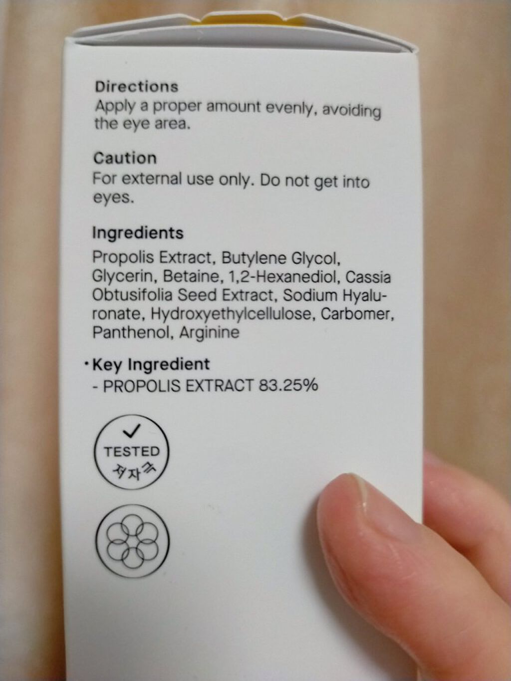 - <30ml> プロポリスエキス、ブチレングリコール、グリセリン、べタイン、1,2-ヘキサンジオール、カッシアオブッシフォリア種子エキス、ヒアルロン酸Na、ヒドロキシエチルセルロース、カルボマー、パンテノール、アルギニン