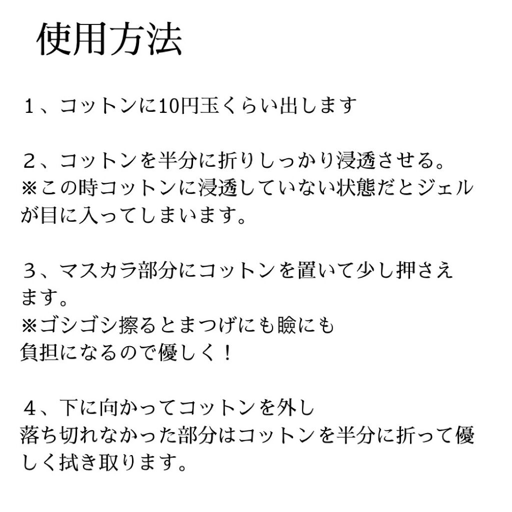 - なじみやすさアップ! ウォータープルーフマスカラもスルンと落ちる! ジェルがさらっとみずみずしくなって、コットンやアイメイクとよりなじみやすくなりました。マスカラクリア成分配合。落ちにくいWPマスカラやアイライナーにもすばやくなじんでするんと落とします。