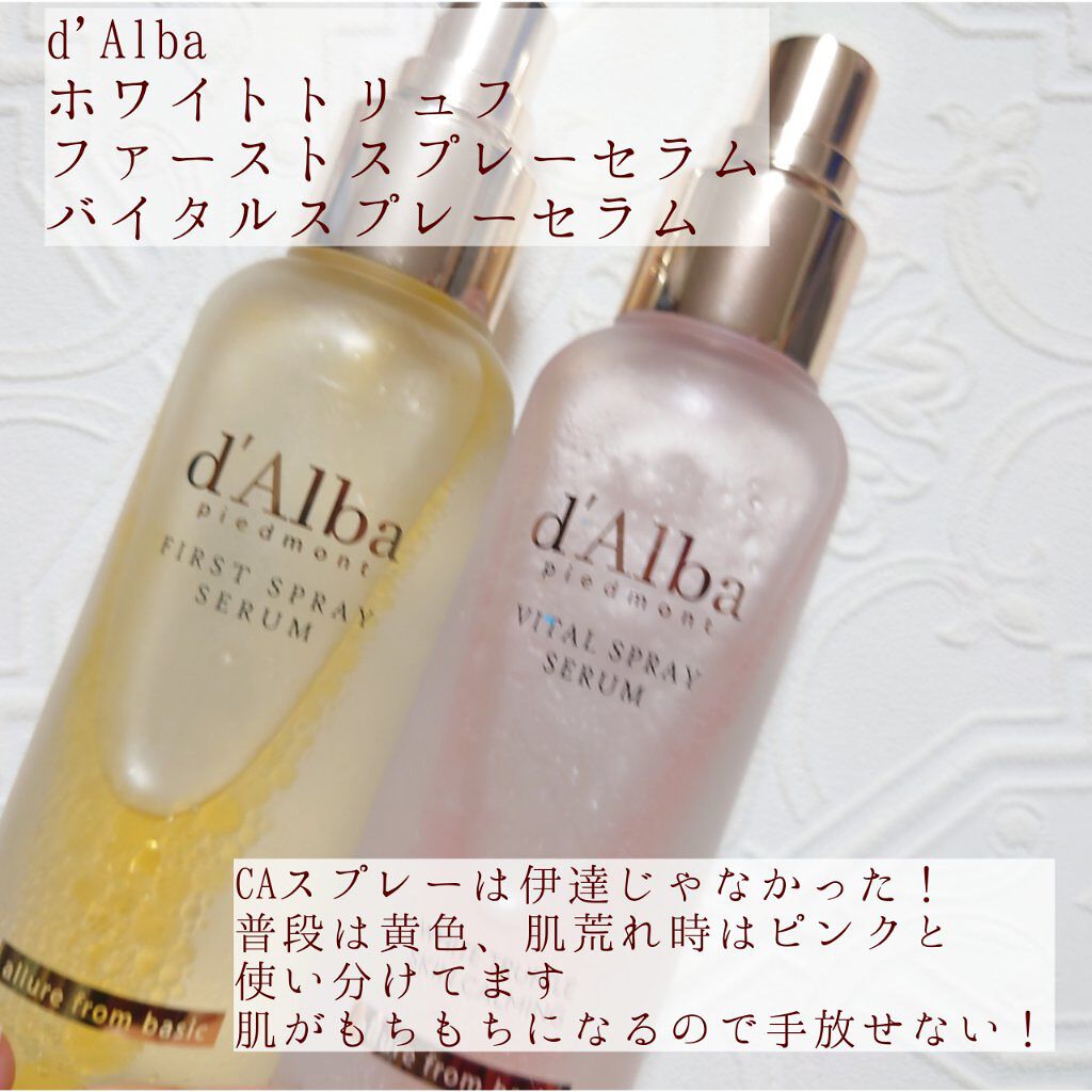 ホワイトトリュフ ファーストスプレーセラムはしっかり保湿が実感できる化粧水。つけると肌がもちもちになります。こちらは以前から使用していてお気に入りです。乾燥肌の方には特におすすめ! ホワイトトリュフ バイタルスプレーセラムは鎮静効果がしっかり体感できてうれしい!そしてピンクの見た目がかわいいです♡ ダルバ、すっかりお気に入りのブランドになりました。他のアイテムも試してみたい~✨