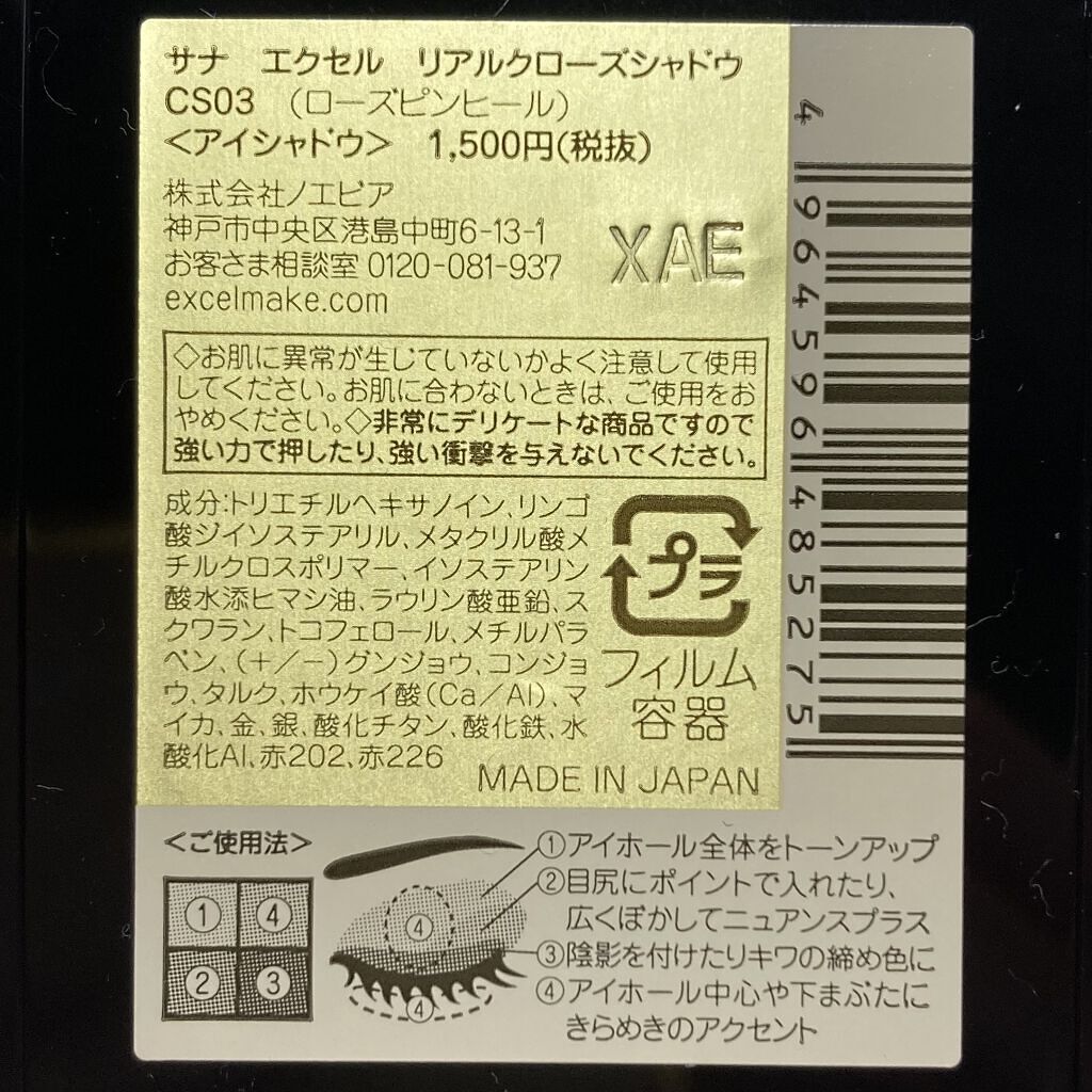 - 1.重ねてもくすまないクリアな発色。ナチュラルに溶け合う絶妙4カラー。 ツヤタイプ(左上・左下カラー):アイホール全体にぼかしたり、目尻へのポイント使いも。 ラメタイプ(右上カラー):アイホール中心や下まぶたにきらめきのアクセント。 マットタイプ(右下カラー):単色で陰影を付けたり、ツヤタイプと重ねてニュアンスをプラス。 2.うっとりするほどリッチな質感で粉飛びしないのに、軽いタッチで伸びて重ねやすいテクスチャー。 3.スクワラン(保湿)配合で目元の乾燥を防ぎます。 [PERFORMANCE] 色と質感の重ね着を楽しむ、ファッション感覚アイシャドウパレット [DESIGN] ・まぶたにひっかからない、なめらかな上質チップ ・薄型コンパクトだからポーチの中でかさばらない [QUALITY] 1.重ねてもくすまないクリアな発色 ナチュラルに溶け合う絶妙4カラー 2.パールの重ね技でまぶたに極上のツヤ感 微細多色 カラーパール 銀コーティング ガラスパール* excel GOLD-MIX処方(金パール配合)* (*右上のシャイニーカラーのみ) 3.うっとりするほどリッチな質感で粉飛び知らず!なのに、軽いタッチで伸びて重ねやすい 4.スクワラン(保湿)配合で目元の乾燥を防ぐ