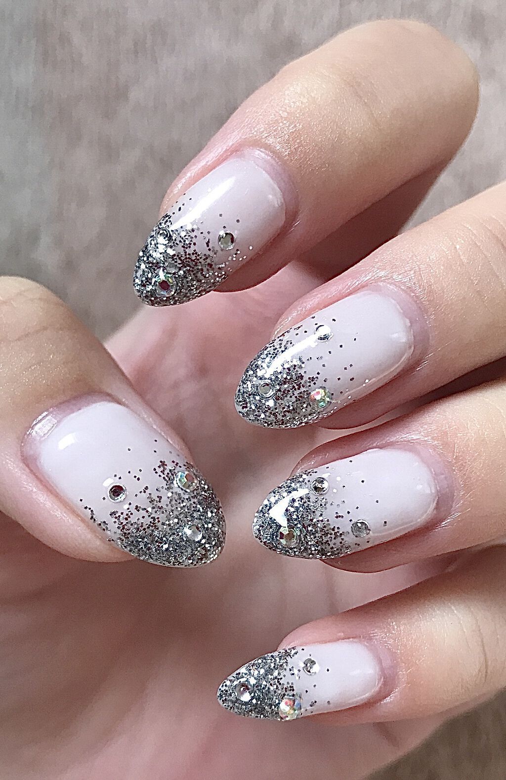 見る角度によってラメ感が変わるのでマグネットジェルおすすめです◎ ミルクホワイトが思ってたより黄味が強くて上からピンクベージュを重ねちゃいました! ストーンをつけるとこで華やかさをプラス◎ ラメを斜めに集めたので輝きが