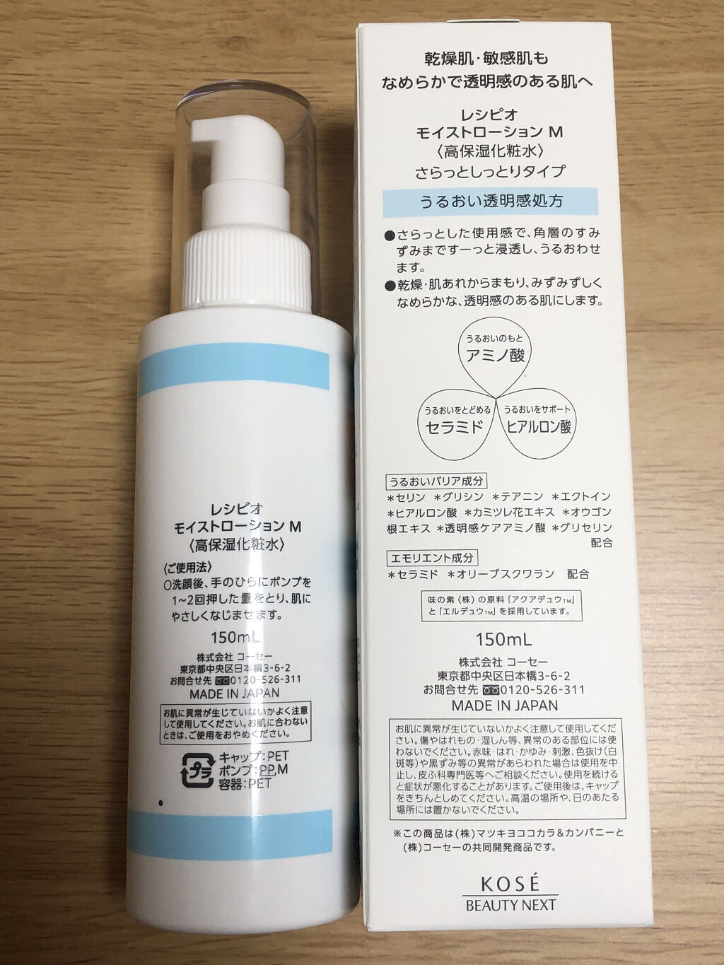 普通の化粧水と同じですがしゃばしゃばしかつかってこなかったわたしにはびっくりなテクスチャーでした! これだけでしっとりする感じなので冬の乾燥の時期はありがたい使い心地でした! レシピオさんのこだわりは・弱酸性・無香料・無着色・アルコールフリー・紫外線吸収剤フリー・パラベンフリー・ラウリル硫酸フリー・マイクロプラスチックフリー・アレルギーテスト済み・敏感肌のかたの協力によるパッチテスト済み・皮膚刺激感テスト済み※すべてのかたにアレルギーや皮膚刺激がおきない刺激感がないというわけではありません。