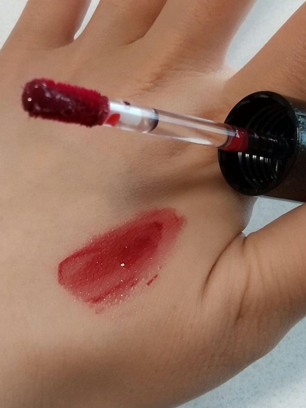 渦をまくようにチューブの中に2色が交互に入っているので、うまく出方を調整できない印象でした…😅 温感成分入り美容オイル配合とのことで、塗った感じが結構あったかいです! また、VIは色はほとんどなく、ラメが想像以上に唇に乗る感じでした💡 ティッシュオフしてしまうと色残りはほとんどない感じがしたので、マスク生活には向かないかも… でも、自宅などマスクしない時にリップケアするなど、可愛くできて気分があがりますね!! 販売スペースには、イエベ向け、ブルベ向けなど記載がありましたが、自分で調整すれば、気にせずどの色も使える気がしました💡
