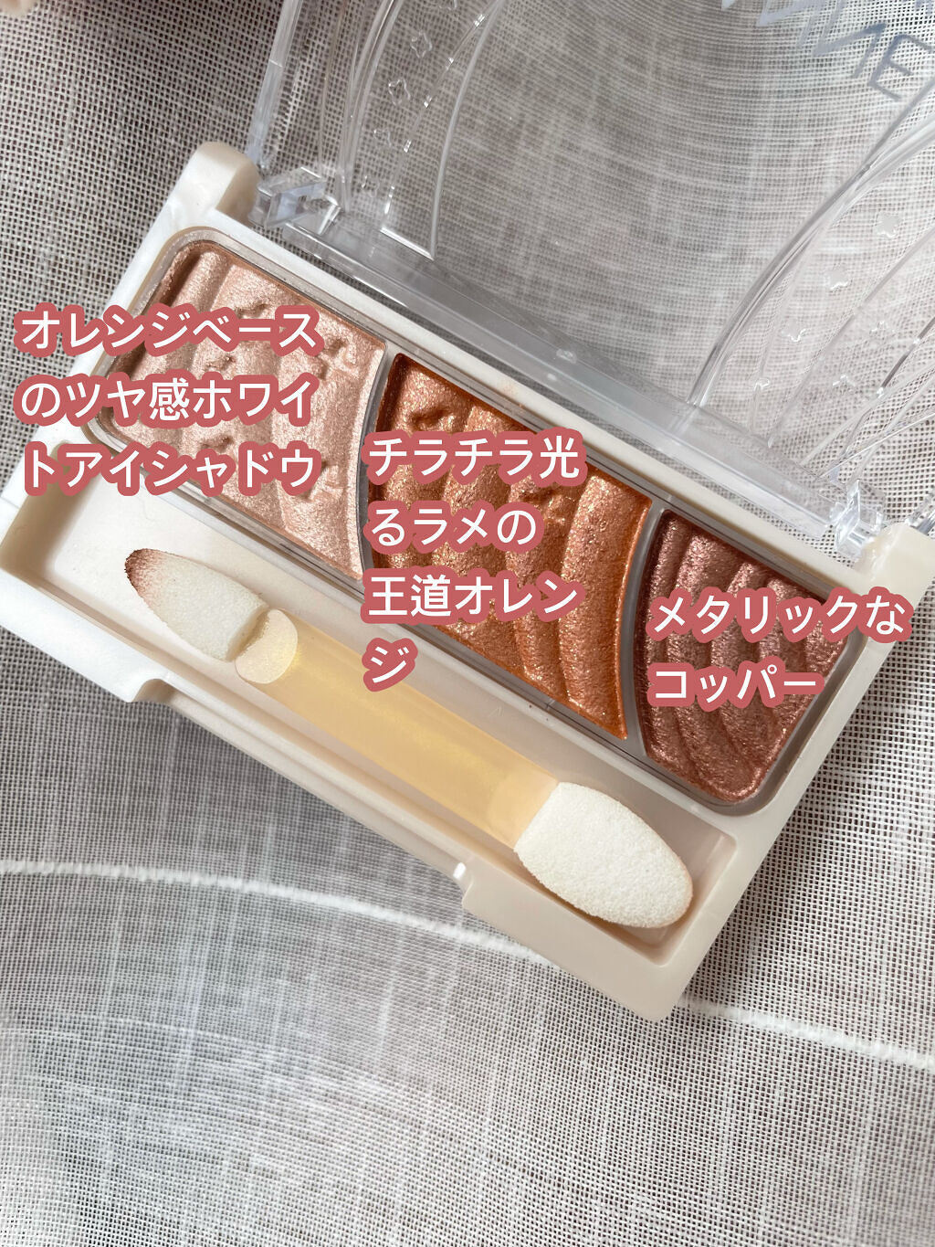 - 3色で簡単に明るく大きな目元に。 しっとり感触のアイシャドウ。 くすみを飛ばす明るさベース、ひとえ・奥二重の方でも幅広く塗れる肌なじみの良い中間色、 濃密高発色の締め色が目の輪郭を強調し大きな目元に。 微細パール配合でくすみを飛ばし、明るい目元へ。