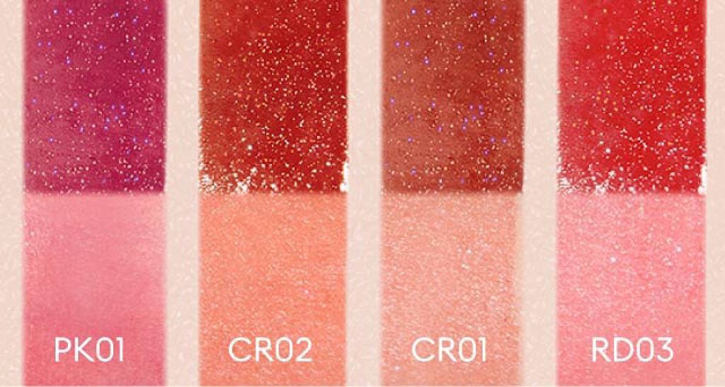 - Point 1 ジューシーなもぎたて果実のような発色が長時間続く Point 2 キラキラ輝くスパークリングジュエリーパウダー配合 Point 3 リップケアオイル配合で、クリアな光沢感のある仕上がり RD03、CR02は公式オンライン限定発売
