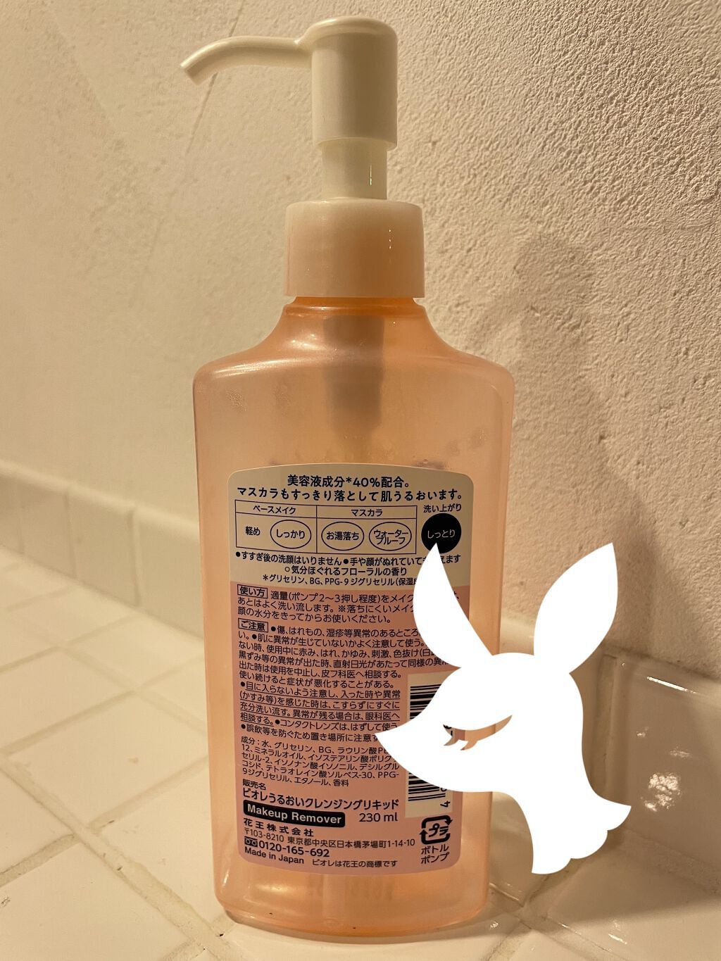 - 美容液成分*40%配合。ウォータープルーフマスカラも、しっかりベースメイクもすっきり落として肌うるおう。リキッドタイプのメイク落とし。 洗い上がりはしっとり。 ●すすぎ後の洗顔はいりません ●手や顔がぬれていても使えます ●気分ほぐれるフローラルの香り *グリセリン、BG、PPG-9ジグリセリル(保湿成分)