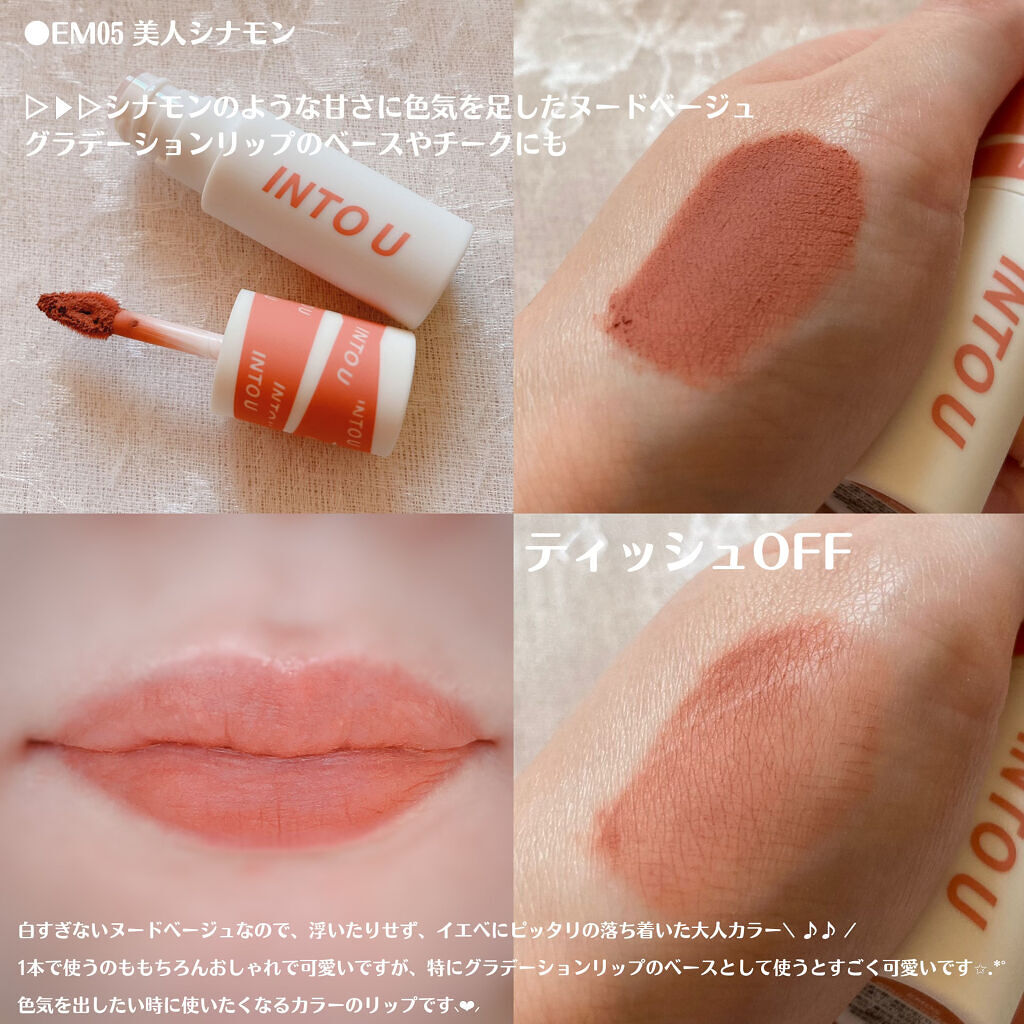INTOU(イントゥユー)スーパーマットリップ&チークマッドINTOU 泥リップ✳カラー✳EM11アーティストモーヴリップにもチークにも使える商品で泥リップEM11アーティストモーヴは、ローズベージュ、とても柔らかい色味でローズよりの粘膜色っ...