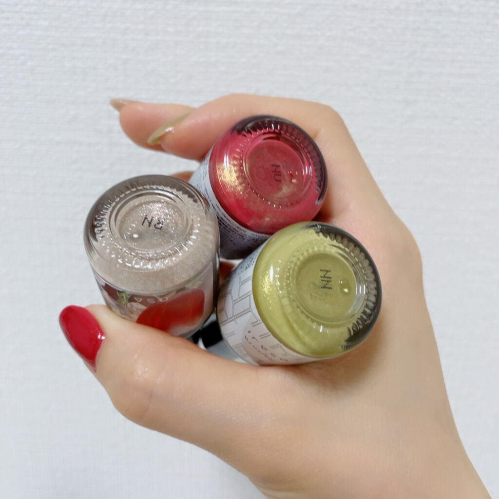OSAJI『蜜』を2度塗り とにかく塗りやすい✨ 特に2度塗りだとムラなく綺麗に塗れます! 1度塗りの方が肌なじみは良い気がしました。 ブルベの方にも使いやすいブラウンだと思います🙌🏻 細かいラメがたくさん入っていて美しい❣️ 透明のベースにホログラムざくざく🌟 濃いめのカラーに乗せるとホロが目立ってかわいい🙆♀️ ホロが筆につきにくくてもうちょっとたくさん入ってればなぁと思ったので悩んでマイナス1。 でもかわいいので次は別の違う筆を使ってもっとぎっしり乗せてみたいと思います😙