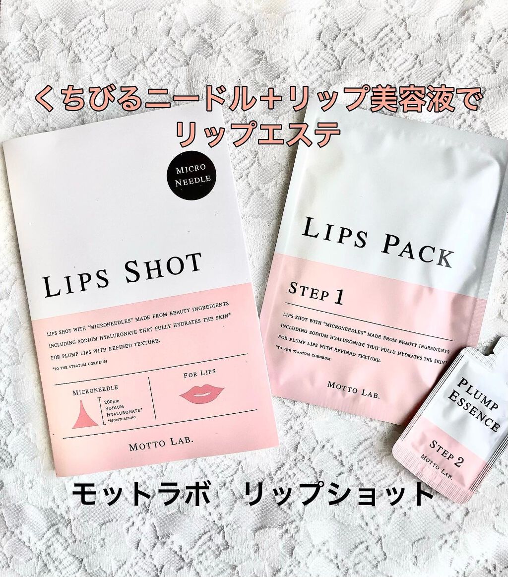 - LIPS SHOTは唇を自然にふっくらさせる唇専用パックです。唇をふっくらさせるヒアルロン酸Naなどのプランプ成分を、針状に結晶化した独自開発のマイクロニードルで、塗るだけでは届かないプランプ成分を唇の角質層までダイレクトに届けることができます。 [セット内容] ・モットラボ リップパック(シート状美容液/1回分) ・モットラボ プランプエッセンス(唇用美容液/2g)