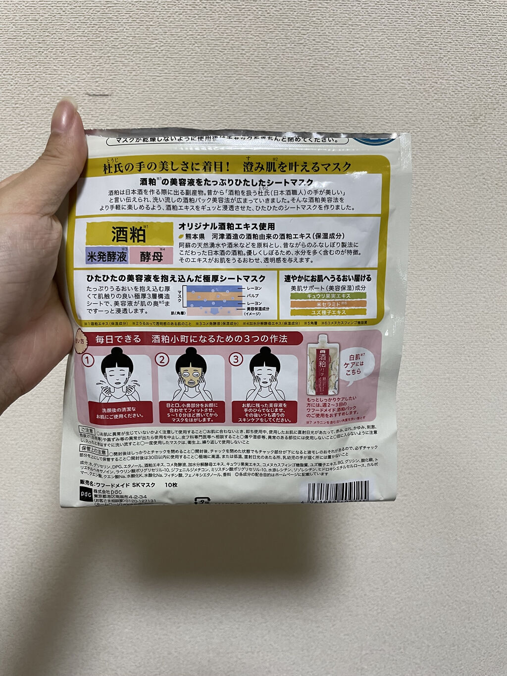 - <酒粕マスク> 水添レシチン、ジフェニルジメチコン、ユズ種子エキス、水添リゾレシチン、コメ発酵液、キュウリ果実エキス、フィチン酸、ラウリン酸ポリグリセリル-10、クエン酸Na、酸化銀、加水分解酵母エキス、ミリスチン酸ポリグリセリル-10、コメヌカスフィンゴ糖脂質、クエン酸、ヒドロキシエチルセルロース、加水分解コラーゲン、水、DPG、アルギニン、トリエチルヘキサノイン、グリチルリチン酸2K、エタノール、香料、フェノキシエタノール、水酸化K、カルボマー、加水分解ヒアルロン酸、酒粕エキス、グリセリン、BG、ペンチレングリコール <酒粕マスク【旧】> グリセリン、DPG、エタノール、酒粕エキス、コメ発酵液、加水分解酵母エキス、キュウリ果実エキス、コメヌカスフィンゴ糖脂質、ユズ種子エキス、BG、グリシン、酸化銀、トリエチルヘキサノイン、ラウリン酸ポリグリセリル‐10、ジフェニルジメチコン、ミリスチン酸ポリグリセリル‐10、水添レシチン、リゾレシチン、ヒドロキシエチルセルロース、カルボマー、クエン酸、クエン酸Na、水酸化K、水酸化Na、フィチン酸、フェノキシエタノール、香料