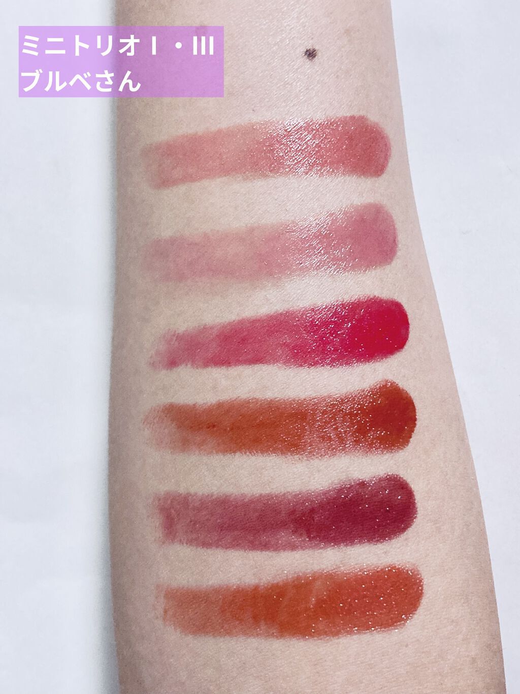 マーブルとグリッター6色ずつの色味は現物に近づけているため、とくに動画では腕がイエベになったりブルベになったりしてます🙇🏻♀️ マーブルプリズム 全体的に淡い発色。②③⑥は割と濃いめに発色するので単色グラデもできそう。 GBR06 グアテマラプリズム 黄味よりのブラウンベース。ピンク・イエロー・ゴールドラメ。マーブルシリーズの中では1番発色が良い。少し薄めの締め色としても使えそう。 GVL03 ストームプリズム 赤味のパープルがベース。彩度の高いピンク・グリーン・ブルーラメが光の角度でチラチラと綺麗。個人的No.1✨ グリッタープリズム 全体的にマーブルよりも発色が良いです。 GBL01 オルゴールプリズム ベースは少しグレー寄りのブルー。ラメはパープルやピンク・ブルー・イエローの多色。
