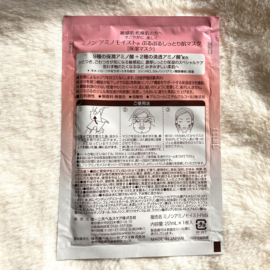 - 思わず触れたくなるほどみずみずしい肌へ。うるおって透明感。 乾燥による小ジワを目立たなくします(効能評価試験済み) 水分を保つ機能が低下しがちな角質層に、バリア機能をサポートする保湿成分を補給 ぷるぷるジェルがしみこんだ密着やわらかシートで、液ダレしません ◎ミノン アミノモイストのシートマスクは化粧水で肌を整えた後にお使いいただく「美容液マスク」です。 週に1-2回のスペシャルケアとしておすすめです♪