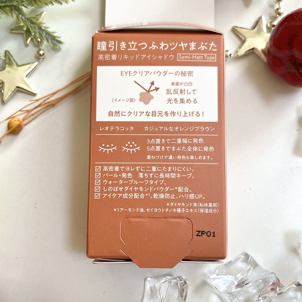 - 高発色×高密着×ラメ感持続のリキッドアイシャドウ。 セミマット・パール・グリッターの3タイプで異なる質感を楽しめます。 密着性の高い柔らかなジェルとサラサラのコートが肌にフィットし、まばたきしてもヨレにくい目元を叶えます。