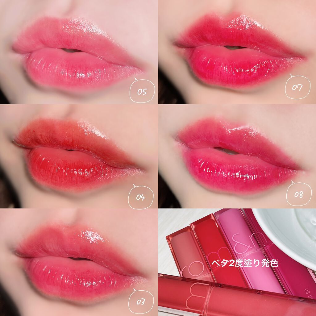 - <01 インコーラル> 水、ビスジグリセリルポリアシルアジペート-2、グリセリン、ジフェニルジメチコン、ジフェニルシロキシフェニルトリメチコン、ポリグリセリン-3、リンゴ酸ジイソステアリル、水添ポリイソブテン、ポリブテン、トリメチルシロキシフェニルジメチコン、変性アルコール、ポリソルベート60、イソノナン酸イソノニル、ペンチレングリコール、(アクリル酸ヒドロキシエチル/アクリロイルジメチルタウリンNa)コポ リマー、ラベンダーエキス、ハナハッカ花/葉/茎エキス、ローズマリーエキス、タイムエキス、ステアリン酸グリセリル、ステアリン酸PEG-100、スクワラン、ラウリルPEG-10トリス(トリメチルシロキシ)シリルエチルジメチコン、エチルヘキシルグリセリン、デキストリン、ステビオシド、イソステアリン酸ソルビタン、エチレンジアミンジコハク酸3Na、水酸化Al、ポリアクリル酸アンモニウム、BG、トコフェロール、フェノキシエタノール、香料、リモネン、酸化チタン、黄5、赤227、黄4、青1 <03 イフローズ> 水、ビスジグリセリルポリアシルアジペート-2、グリセリン、ジフェニルジメチコン、ジフェニルシロキシフェニルトリメチコン、ポリグリセリン-3、リンゴ酸ジイソステアリル、水添ポリイソブテン、ポリブテン、トリメチルシロキシフェニルジメチコン、変性アルコール、ポリソルベート60、イソノナン酸イソノニル、ペンチレングリコール、(アクリル酸ヒドロキシエチル/アクリロイルジメチルタウリンNa)コポリマー、ラベンダーエキス、ハナハッカ花/葉/茎エキス、ローズマリーエキス、タイムエキス、ステアリン酸グリセリル、ステアリン酸PEG-100、スクワラン、ラウリルPEG-10トリス(トリメチルシロキシ)シリルエチルジメチコン、エチルヘキシルグリセリン、デキストリン、ステビオシド、トリイソステアリン酸ポリグリセリル-2、イソステアリン酸ソルビタン、エチレンジアミンジコハク酸3Na、水酸化Al、ポリアクリル酸アンモニウム、BG、トコフェロール、フェノキシエタノール、香料、リモネン、酸化チタン、黄5、赤227、青1、黄4、赤218 <04 チリアップ> 水、ビスジグリセリルポリアシルアジペート-2、グリセリン、ジフェニルジメチコン、ジフェニルシロキシフェニルトリメチコン、ポリグリセリン-3、リンゴ酸ジイソステアリル、水添ポリイソブテン、ポリブテン、トリメチルシロキシフェニルジメチコン、変性アルコール、ポリソルベート60、イソノナン酸イソノニル、ペンチレングリコール、(アクリル酸ヒドロキシエチル/アクリロイルジメチルタウリンNa)コポ リマー、ラベンダーエキス、ハナハッカ花/葉/茎エキス、ローズマリーエキス、タイムエキス、ステアリン酸グリセリル、ステアリン酸PEG-100、スクワラン、ラウリルPEG-10トリス(トリメチルシロキシ)シリルエチルジメチコン、エチルヘキシルグリセリン、デキストリン、ステビオシド、イソステアリン酸ソルビタン、エチレンジアミンジコハク酸3Na、トコフェロール、BG、フェノキシエタノール、料、リモネン、黄5、赤227、黄4、青1 <06 チュリアン> 水、ビスジグリセリルポリアシルアジペート-2、グリセリン、ジフェニルジメチコン、ジフェニルシロキシフェニルトリメチコン、ポリグリセリン-3、リンゴ酸ジイソステアリル、水添ポリイソブテン、ポリブテン、トリメチルシロキシフェニルジメチコン、変性アルコール、ポリソルベート60、イソノナン酸イソノニル、ペンチレングリコール、(アクリル酸ヒドロキシエチル/アクリロイルジメチルタウリンNa)コポリマー、ラベンダーエキス、ハナハッカ花/葉/茎エキス、ローズマリーエキス、タイムエキス、ステアリン酸グリセリル、ステアリン酸PEG-100、スクワラン、ラウリルPEG-10トリス(トリメチルシロキシ)シリルエチルジメチコン、エチルヘキシルグリセリン、デキストリン、ステビオシド、イソステアリン酸ソルビタン、エチレンジアミンジコハク酸3Na、水酸化Al、ポリアクリル酸アンモニウム、BG、トコフェロール、フェノキシエタノール、香料、リモネン、酸化チタン、黄5、赤227、酸化鉄、黄4、赤218、青1 <08 ベリーディヴァイン> 水、ビスジグリセリルポリアシルアジペート-2、グリセリン、ジフェニルジメチコン、ジフェニルシロキシフェニルトリメチコン、ポリグリセリン-3、リンゴ酸ジイソステアリル、水添ポリイソブテン、ポリブテン、トリメチルシロキシフェニルジメチコン、変性アルコール、ポリソルベート60、イソノナン酸イソノニル、ペンチレングリコール、(アクリル酸ヒドロキシエチル/アクリロイルジメチルタウリンNa)コポリマー、ラベンダーエキス、ハナハッカ花/葉/茎エキス、ローズマリーエキス、タイムエキス、ステアリン酸グリセリル、ステアリン酸PEG-100、スクワラン、ラウリルPEG-10トリス(トリメチルシロキシ)シリルエチルジメチコン、エチルヘキシルグリセリン、イソステアリン酸ソルビタン、デキストリン、ステビオシド、エチレンジアミン