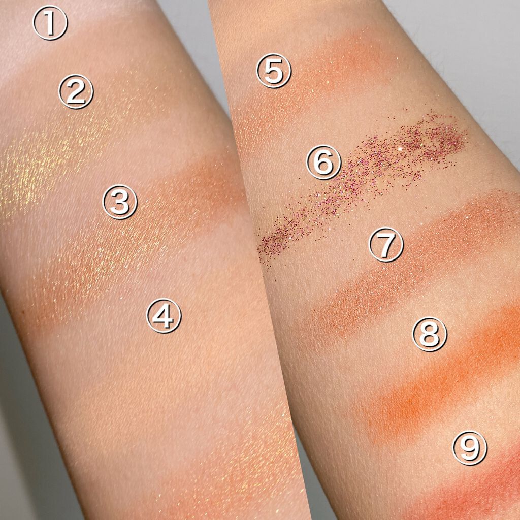 マットだけどどこかツヤ感もあるような柔らかい粉質……なのに粉飛びも少なめなので 瞼に乗せやすい🥰 5番のラメ感は控えめ。 シャンパンカラーに多色ラメがチラッ|˙꒳˙)✨ 実はこの番号通りにカラーを使うとプロ並みのメイクが完成するらしいです……‼️ ケースも薄くてコンパクトなのにベースカラー、ラメ、締め色、チークまで付いてるので 持ち運びやいつか行けるようになるであろう旅行などにも良さそうです❣️