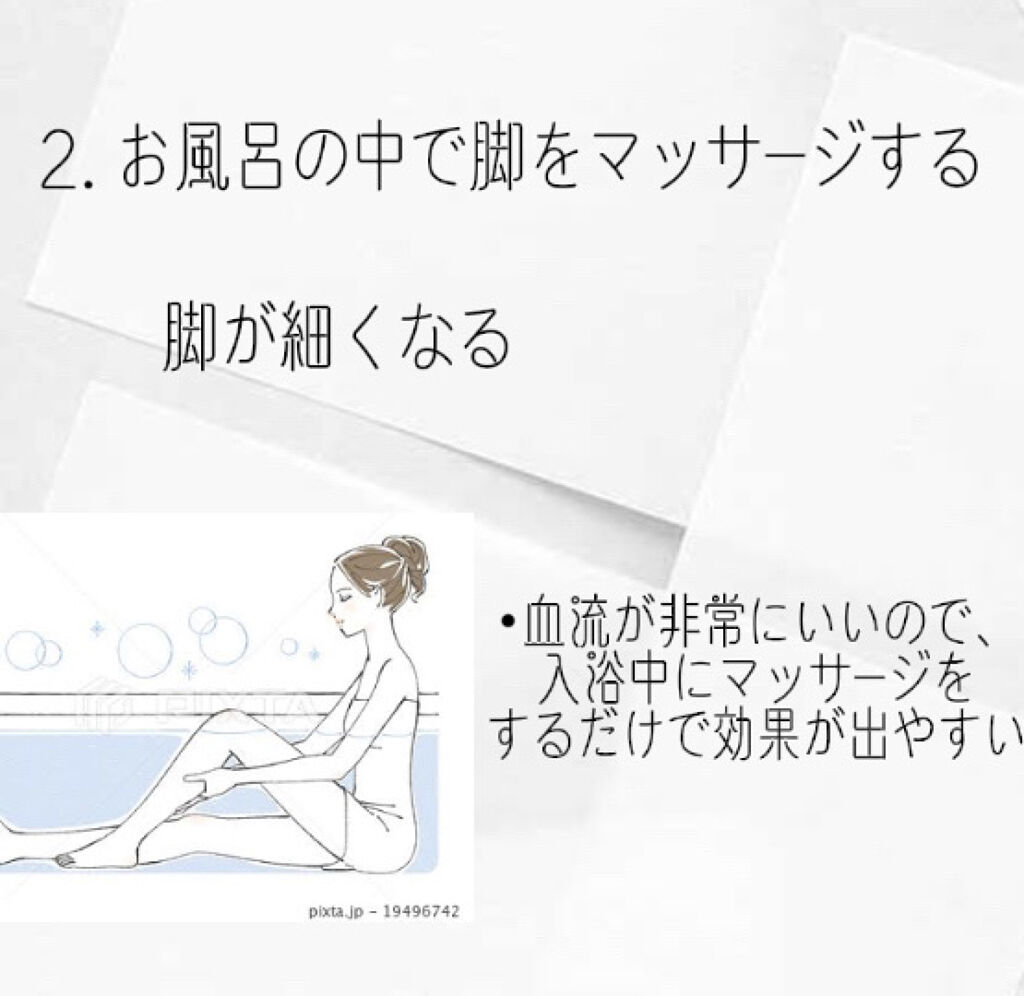 ボディークリームをしっかり塗ることボディークリームを塗ることで保湿をしっかりされます カサカサな脚よりはちゃんと保湿された脚の方がいいですよね! 湯船に浸かりながら脚をマッサージすること湯船に浸かりながらマッサージすることで脚が細くなりやすいです! 髪の毛をサラサラにすること髪の毛をサラサラにすることで清潔感が一気に上がります!! アホ毛を無くすことアホ毛を無くすことで清潔感が上がります 肌を白くすること肌を白くすることで透明感がでます! 肌を綺麗にすることニキビを無くすこと肌が綺麗とより透明感が増します!