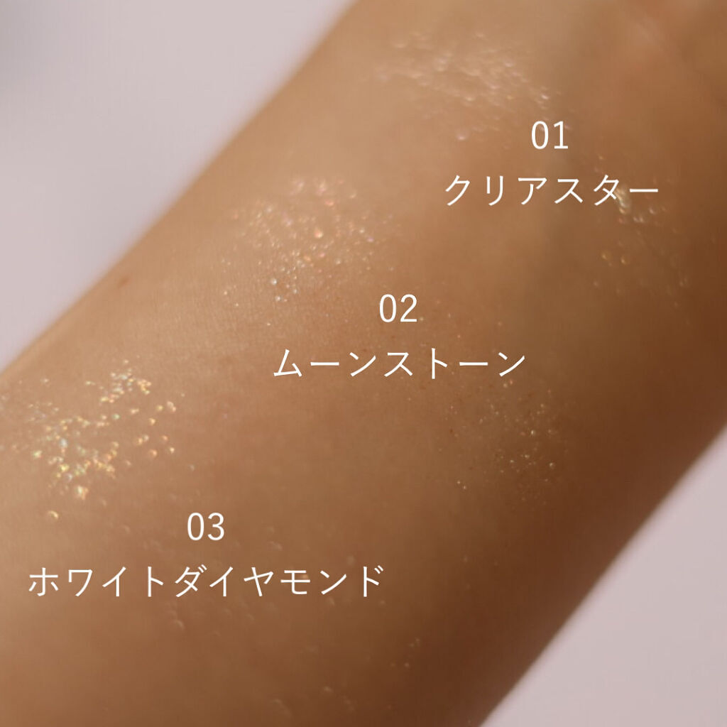 こちらのグリッターは大粒ラメが印象的で結構派手目な仕上がりになります。 どのカラーもベースカラーはあまりついていないように感じました。 アプリケーターはシリコンになっていて衛生面が👌ただ付属のシリコンチップは大きめで少し塗りにくいので別のブラシを使うことをおすすめします。