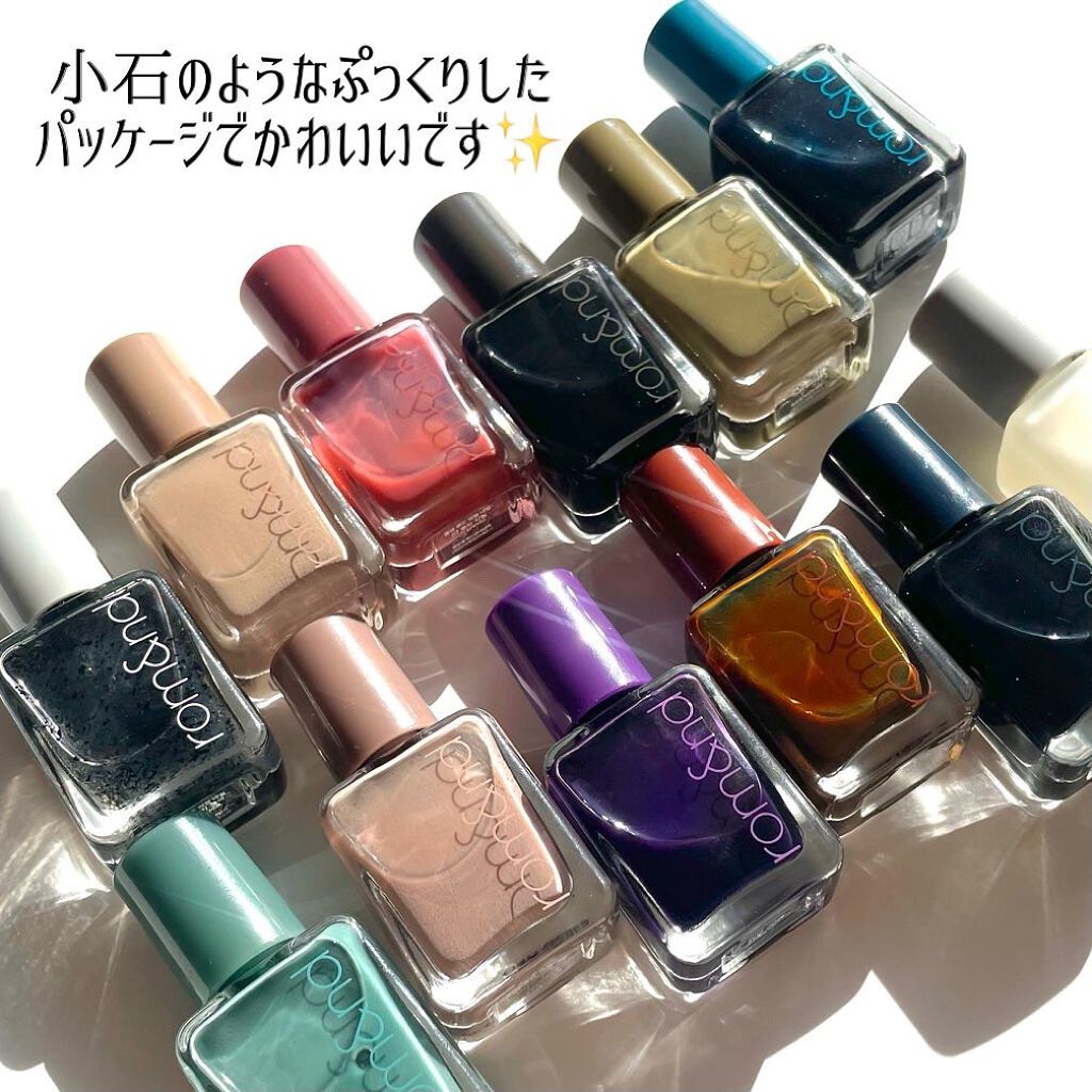 - 指先に玉石のような、ならかな光沢をとどめる。塗った瞬間から綺麗なツヤと光沢を維持し、重ねて塗っても透き通ったカラー感を鮮やかにとどめる、素早い乾燥力のナチュラルカラーネイル。「ロムアンド」の次世代型ネイルです。