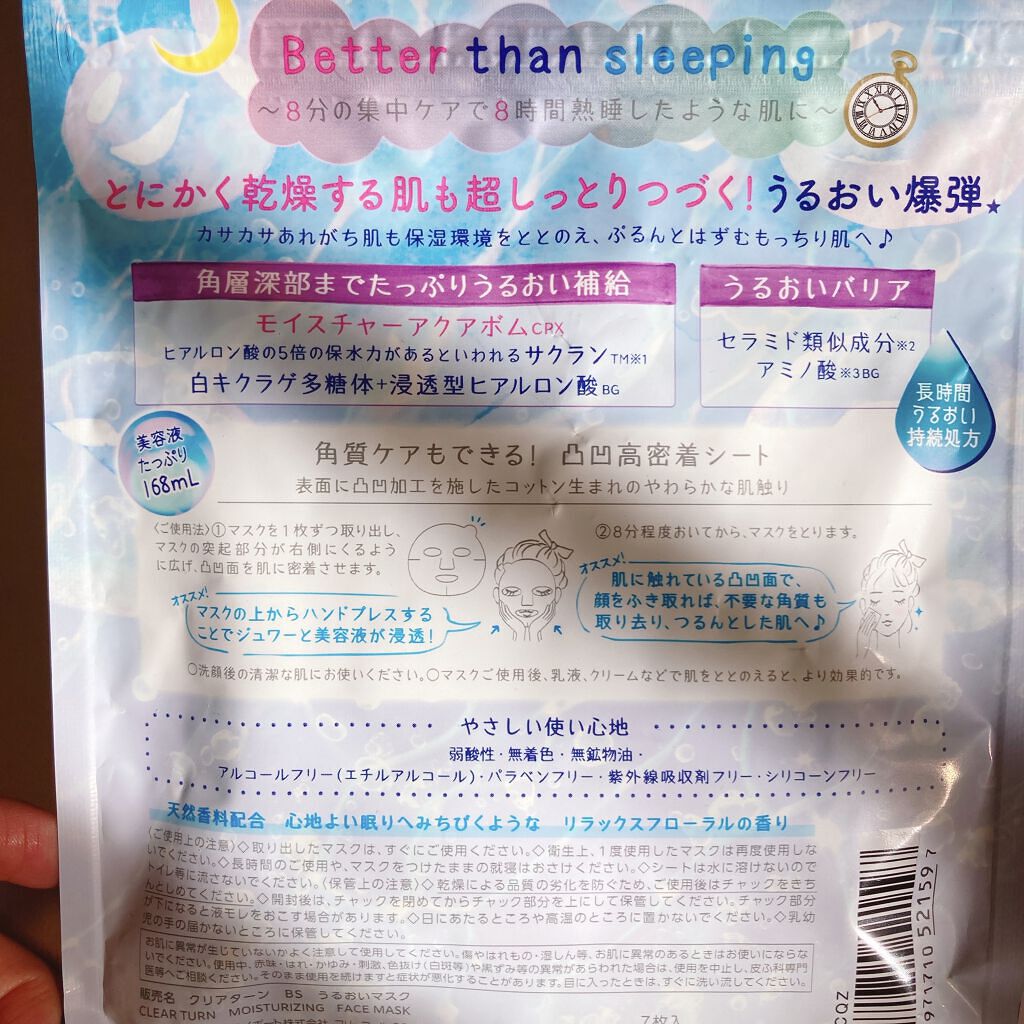 ♡クリアターンうるうるBOMB7枚入心地よい眠りへみちびくようなリラックスフローラルの香り。oOo。.:♥:.。oOo。.:♥:.。oOo。.:♥うるうるBOMB初めて使用してみました!香りもよくパックも広げやすく付けやすい☺️8分程度おくだ...