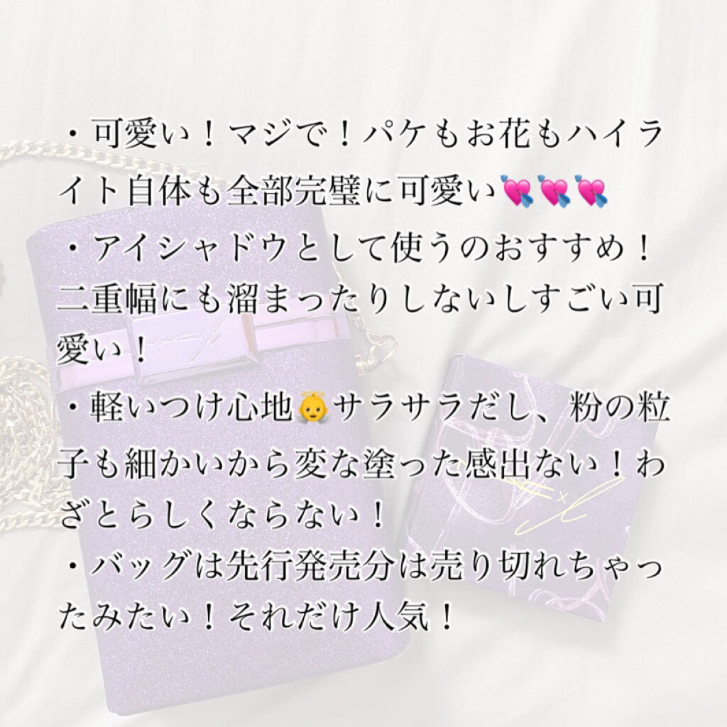コスオタサラさんのYouTube見て欲しくなってメガ割で買いました!開ける前から可愛かった〜ほんとに。パッケージから箱なんて捨てちゃうのにさ、捨てるの惜しいくらい可愛い😣💘💘 中国コスメらしく外側から作り込んであってこれ持ってるだけでテンション上がる でも!ちゃんと中も優秀!ハイライト、チーク、アイシャドウとして使えるパレットですが、マットなカラーもあるのでアイブロウにも使えます。なんならノーズシャドウも入れれます。👏👏 アイシャドウもすっごい可愛くて、特に右上のラメと右下2色がお気に入り❤️🔥ラメがすっごい綺麗でメイクのいいアクセントになります! 届くまでは結構時間かかったけど、うちのちっちゃいポストにも入るサイズで送ってくれるから助かった! 他にもカラーありましたので気になった方はぜひ!参考になると嬉しいです🙄✨