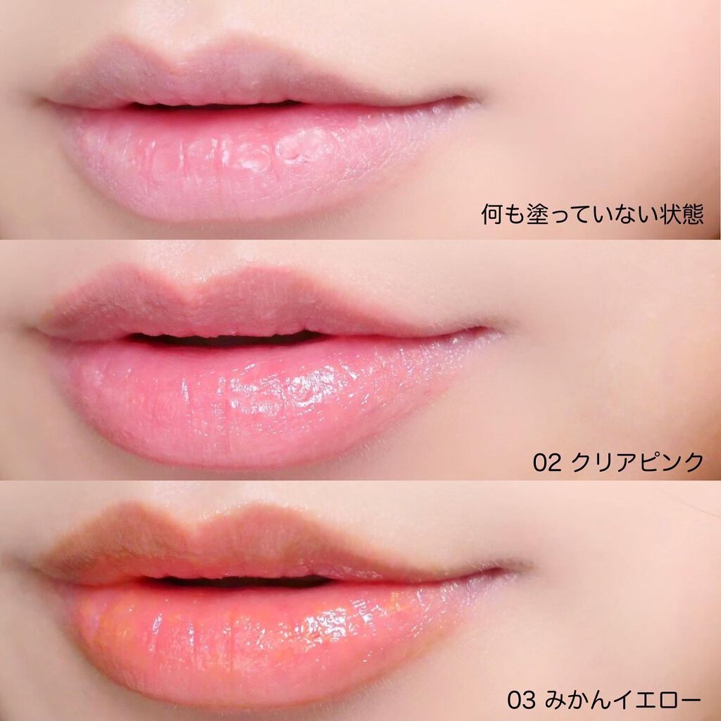 粒が大きすぎなくて塗りやすい プランプ効果も少しあるから、より縦じわにいい 03みかんイエローの方は色がほんのり付く サッと塗るのにちょうどいいコスメ 縦じわが気になる人にオススメ