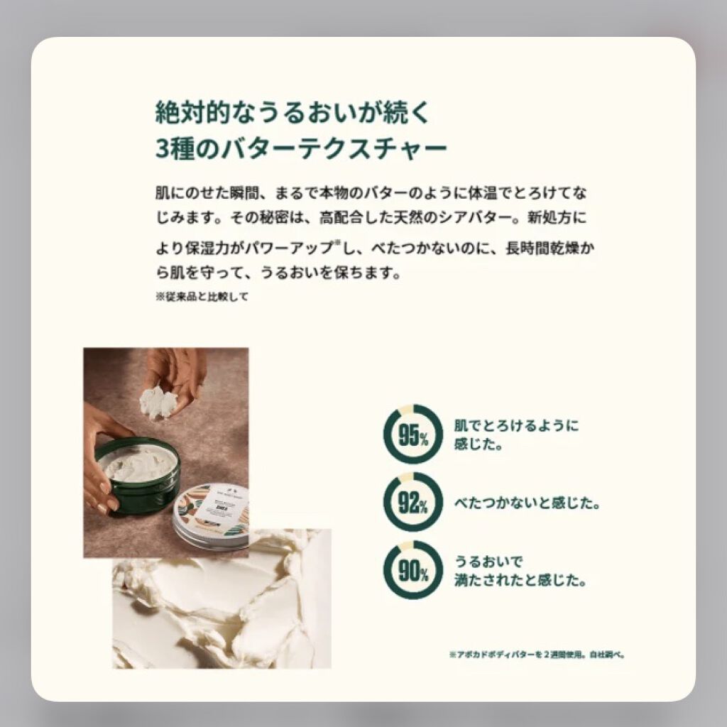 - <ボディクリーム> 97%自然由来成分配合で、格別にリッチでこっくりとしたバターのように溶ける、うるおうのにべたつきにくいテクスチャーの、シアバター(保湿成分)を配合したボディクリーム。肌を深いうるおいで満たし、しっとりやわらかな肌に導きます。 ほのかに甘く優しいシアの香りで、心なごみおだやかな気分に包まれます。 保湿成分シアバター・ババスオイル配合で、乾燥して固くなった肌をうるおいで満たし、やわらかくなめらかな肌を長時間保ちます。 <テスクチャー・仕上がり> ・格別にリッチでこっくりしたバターのような、体温でとろけるテクスチャー:エクストラリッチバター ・あと肌うっとりする保湿感 <お肌のタイプ> ベリードライスキン <シリーズ特徴>※ボディバター全種類に共通しております ー独自のバターテクスチャーで、長時間うるおいを感じる肌へー すべてのボディバターに、コミュニティフェアトレードの保湿成分シアバターを配合し、長時間うるおいをキープ。 ーヴィーガン認証ー ヴィーガン認証の代表的な存在であるヴィーガン協会から認証を受けた動物にも配慮した商品です。 ーパッケージー 100%リサイクル可能な容器は、インドのプラスチックフォーチェンジ社のコミュニティフェアトレード再生プラスチックを使用。アルミの蓋も100%リサイクル可能となっており、よりサステナブルなパッケージに進化しました。