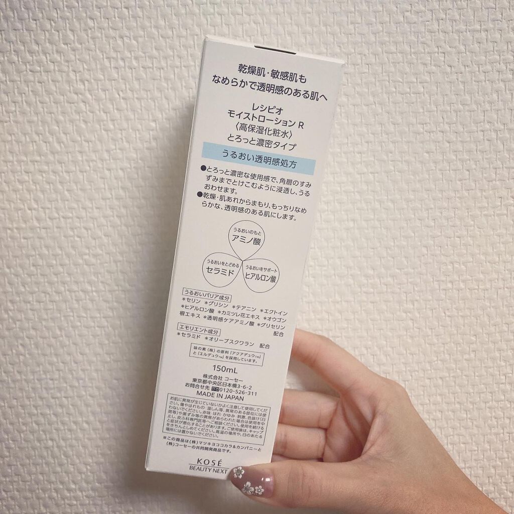 レシピオ🩵最初は化粧水だけを使っていましたが、とても良かったので今回は乳液も一緒にマツキヨで購入しました。化粧水は詰め替えがあったのでそれを購入しました!肌が乾燥してヒリヒリしていましたがこれは大丈夫で良かったです。ちゃんと保湿してくれるし、...