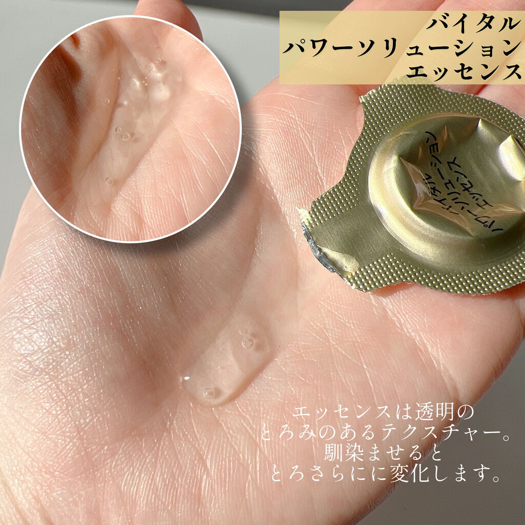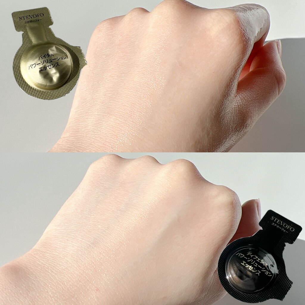 バイタル パワーソリューションエッセンス 透明でみずみずしいテクスチャー。伸びが良くて潤いを感じます✨ ディフェンス パワーソリューションエッセンス 少し白濁色。こちらも伸びのみずみずしいテクスチャー。お肌をなめらかに整えてくれるそう✨ さらりと使用感のいい美容液です🥰👏 化粧水感覚のみずみずしさがあるのでベタつきが苦手な方にも使いやすい美容液です💕