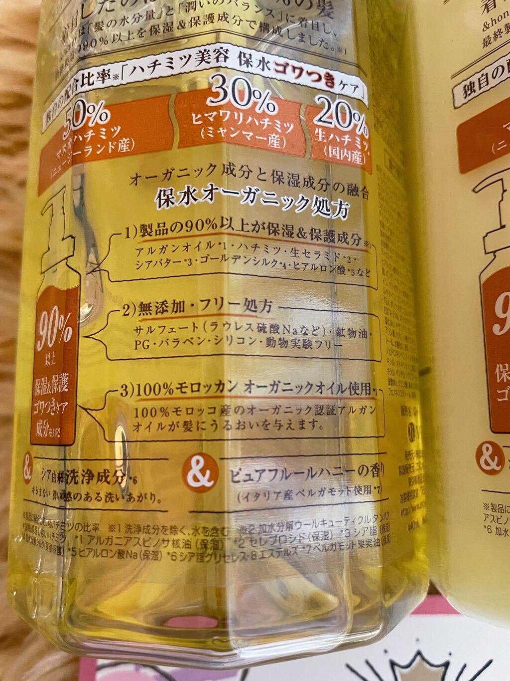 - <ヘアトリートメント(詰替)385g> 水、ラウラミドプロピルベタイン、ラウロイルメチルアラニンNa、コカミドプロピルベタイン、オレフィン(C14-16)スルホン酸Na、グリセリン、コカミドDEA、ハチミツ、加水分解ハチミツタンパク、アルガニアスピノサ核油、シア脂グリセレス-8エステルズ、加水分解シルク、イソステアロイル加水分解シルク、加水分解ウールキューティクルタンパク、γ-ドコサラクトン、ヒアルロン酸Na、セレブロシド、シア脂、パンテノール、ケラチン(羊毛)、ゼイン、ベルガモット果実油、ミリスチルベタイン、ココイルグルタミン酸TEA、ポリクオタニウム-47、PPG-7、EDTA-2Na、ポリクオタニウム-10、塩化Na、キサンタンガム、イソステアリン酸、セバシン酸ジエチル、メントール、水酸化K、黄5、ジエチルアミノヒドロキシベンゾイル安息香酸ヘキシル、メトキシケイヒ酸エチルヘキシル、ペンチレングリコール、安息香酸Na、クエン酸、黄4、DPG、BG、フェノキシエタノール、香料、セテアリルアルコール、ベヘントリモニウムクロリド、ジメチコン、トリエチルヘキサノイン、ソルビトール、セイヨウナシ果実エキス、ヒドロキシエチルセルロース、ペンテト酸5Na、クエン酸Na、アミノプロピルジメチコン <シャンプー本体440ml> 水、ラウラミドプロピルベタイン、ラウロイルメチルアラニンNa、コカミドプロピルベタイン、オレフィン(C14-16)スルホン酸Na、グリセリン、コカミドDEA、ハチミツ、加水分解ハチミツタンパク、アルガニアスピノサ核油、シア脂グリセレス-8エステルズ、加水分解シルク、イソステアロイル加水分解シルク、加水分解ウールキューティクルタンパク、γ-ドコサラクトン、ヒアルロン酸Na、セレブロシド、シア脂、パンテノール、ケラチン(羊毛)、ゼイン、ベルガモット果実油、ミリスチルベタイン、ココイルグルタミン酸TEA、ポリクオタニウム-47、PPG-7、EDTA-2Na、ポリクオタニウム-10、塩化Na、キサンタンガム、イソステアリン酸、セバシン酸ジエチル、メントール、水酸化K、黄5、ジエチルアミノヒドロキシベンゾイル安息香酸ヘキシル、メトキシケイヒ酸エチルヘキシル、ペンチレングリコール、安息香酸Na、クエン酸、黄4、DPG、BG、フェノキシエタノール、香料 <ヘアトリートメント本体445g> 水、セテアリルアルコール、ベヘントリモニウムクロリド、グリセリン、ジメチコン、トリエチルヘキサノイン、ソルビトール、ハチミツ、加水分解ハチミツタンパク、アルガニアスピノサ核油、加水分解シルク、イソステアロイル加水分解シルク、加水分解ウールキューティクルタンパク、γ-ドコサラクトン、ヒアルロン酸Na、セレブロシド、シア脂、パンテノール、ケラチン(羊毛)、ゼイン、セイヨウナシ果実エキス、キサンタンガム、ヒドロキシエチルセルロース、ペンテト酸5Na、クエン酸、クエン酸Na、セバシン酸ジエチル、黄4、イソステアリン酸、アミノプロピルジメチコン、DPG、BG、フェノキシエタノール、香料 <シャンプー(詰替)350ml> 水、ラウラミドプロピルベタイン、ラウロイルメチルアラニンNa、コカミドプロピルベタイン、オレフィン(C14-16)スルホン酸Na、グリセリン、コカミドDEA、ハチミツ、加水分解ハチミツタンパク、アルガニアスピノサ核油、シア脂グリセレス-8エステルズ、加水分解シルク、イソステアロイル加水分解シルク、加水分解ウールキューティクルタンパク、γ-ドコサラクトン、ヒアルロン酸Na、セレブロシド、シア脂、パンテノール、ケラチン(羊毛)、ゼイン、ベルガモット果実油、ミリスチルベタイン、ココイルグルタミン酸TEA、ポリクオタニウム-47、PPG-7、EDTA-2Na、ポリクオタニウム-10、塩化Na、キサンタンガム、イソステアリン酸、セバシン酸ジエチル、メントール、水酸化K、黄5、ジエチルアミノヒドロキシベンゾイル安息香酸ヘキシル、メトキシケイヒ酸エチルヘキシル、ペンチレングリコール、安息香酸Na、クエン酸、黄4、DPG、BG、フェノキシエタノール、香料 <ヘアトリートメント(詰替)350g> 水、セテアリルアルコール、ベヘントリモニウムクロリド、グリセリン、ジメチコン、トリエチルヘキサノイン、ソルビトール、ハチミツ、加水分解ハチミツタンパク、アルガニアスピノサ核油、加水分解シルク、イソステアロイル加水分解シルク、加水分解ウールキューティクルタンパク、γ-ドコサラクトン、ヒアルロン酸Na、セレブロシド、シア脂、パンテノール、ケラチン(羊毛)、ゼイン、セイヨウナシ果実エキス、キサンタンガム、ヒドロキシエチルセルロース、ペンテト酸5Na、クエン酸、クエン酸Na、セバシン酸ジエチル、黄4、イソステアリン酸、アミノプロピルジメチコン、DPG、BG、フェノキシエタノール、香料 <お試し(シャンプー10ml+トリートメント10g)> 水、ラウラミドプロピルベタイン、ラウロイルメチルアラニンNa、コカミドプロピルベタイン、オレフィン(C14-16)スルホン酸Na、グリセリン、コカミドDEA、ハチミツ、加水分解ハチミツタンパク、アルガニアス