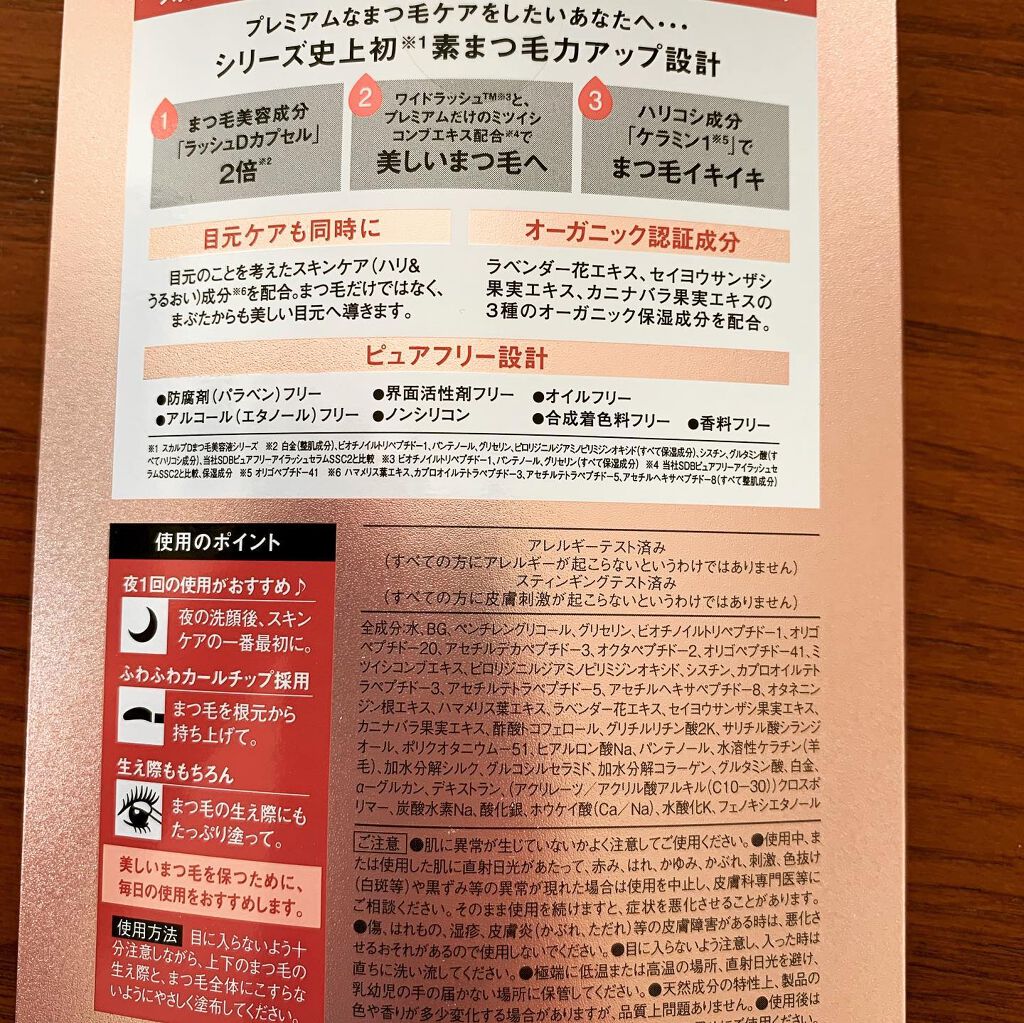 - スカルプDのまつ毛美容液プレミアムは、まつ毛ケア成分を通常品の2倍配合しており、1日1回のケアでもOK♪ さらに、プレミアムには、目元ケア成分配合。まつ毛のハリコシがアップし、上向きカールまつ毛をぐ~んとキープ♪ 使いやすさ・やさしさにこだわった、ふわふわカールチップ採用で根元からも塗りやすく、敏感な目元にやさしい使い心地です。 シリコン、オイル、アルコール(エタノール)、防腐剤(パラベン)、香料、合成着色料、界面活性剤、プロスタグランジン類似物質の8つの成分不使用の“ピュアフリー設計”を実現。 まつ毛エクステ、まつ毛パーマにもご使用いただけます。