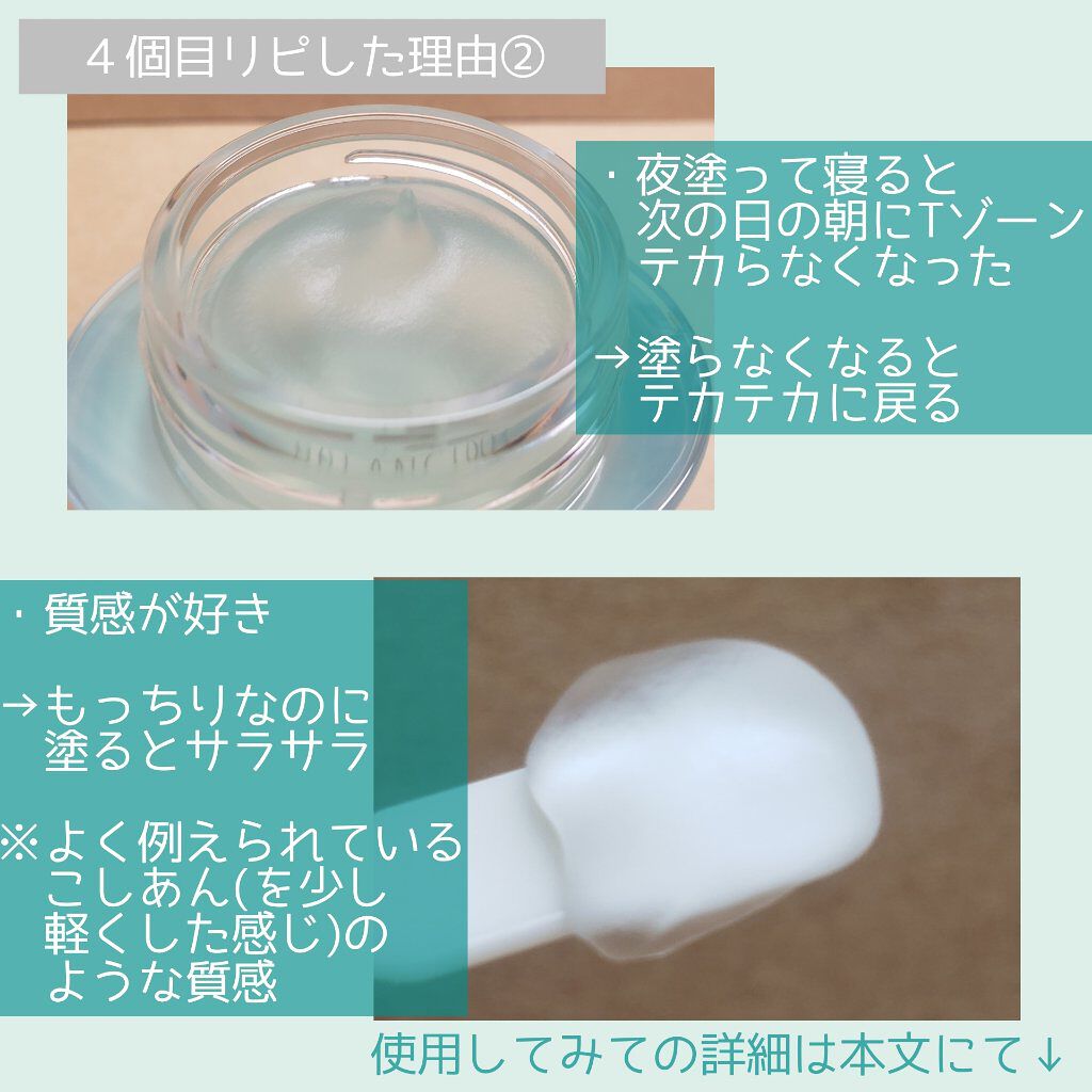 夜寝る前に塗ると、次の日の朝起きたときに顔のテカりが気にならなくなる。 メイクのノリがよくなる。 クリームの質が面白く、使い心地がよい。 珍しい形状の容器だが、最後まで綺麗に使いきることができる。 塗布した肌がサラサラな質感になる。 肌、ニキビ、ニキビ跡等への刺激は感じられなかった。