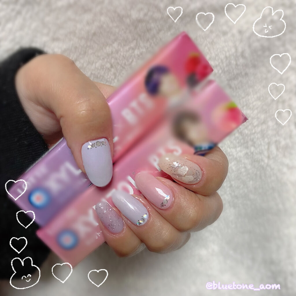 ラメがしっかりしてるし クリアカラーが入ってるから オーロラパウダー無しでも 充分キラキラしました! 反射強めのフィルムなので 実物はもっと うるうるとキラキラが強いです! ビー玉みたい🥺 ネイルシール長持ちさせたいけど ちょっと飽きてきたな〜って時とかに 全然違った印象になるのでオススメです! Seriaのベースジェル 本当にうるうるネイルしやすいので オススメしたい🙆♀️