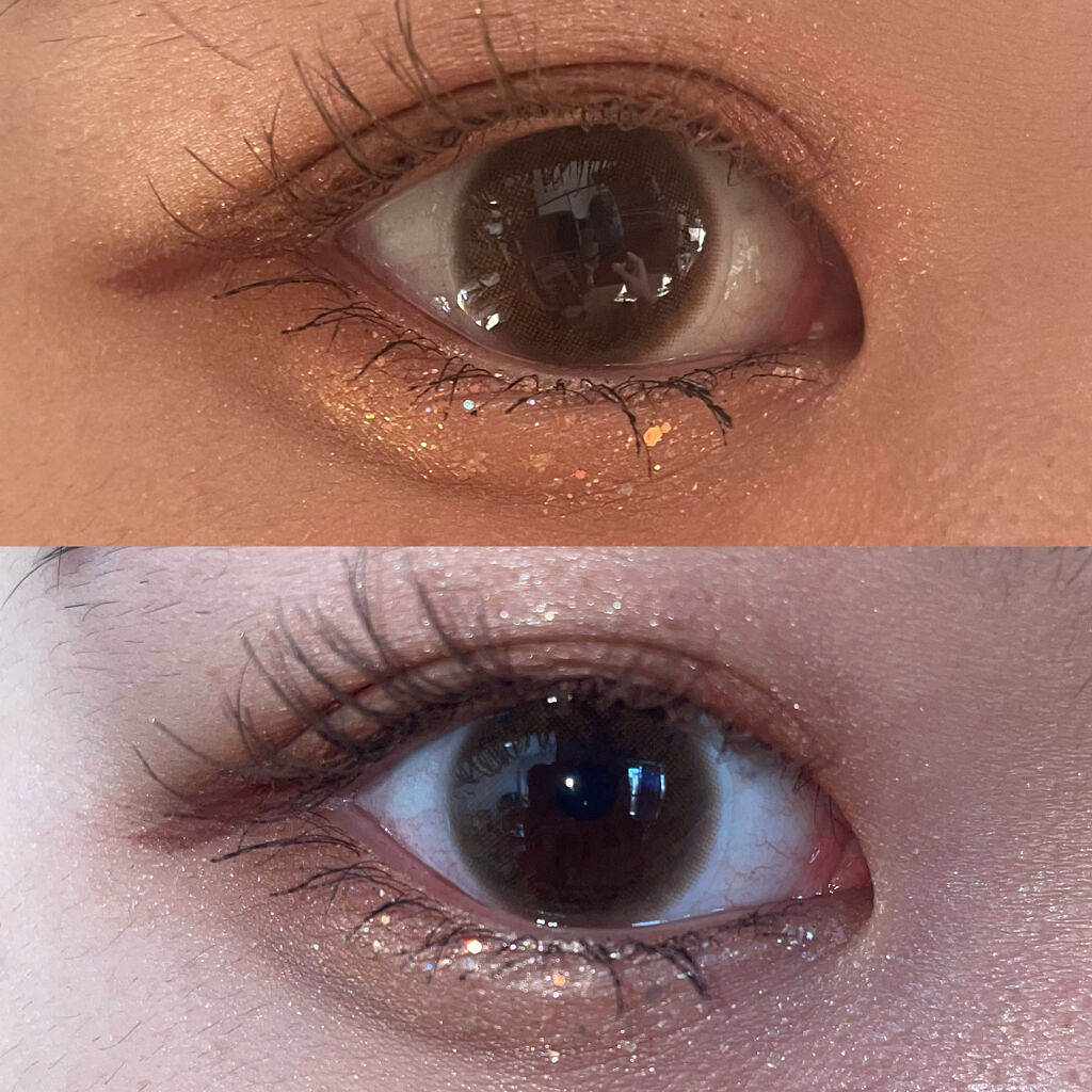 細かいラメと大きめのホログラムが混じっています꒰ˆ•ﻌ•ˆ꒱ 瞬きする度にキラキラしてかわいいです。 よく見ると色々なカラーのラメでてきていますがつけると自然ですฅʕ •ﻌ• ʔฅ