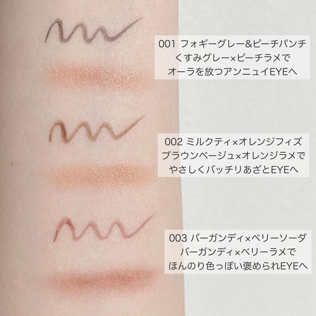 - ジェル×キラパウダーでアレンジ自在!重ねてキラリ、キュンライン♪ ジェルライナーとキラキラのアイカラーが1本になったダブルエンドタイプ。 Chapter.1 ジェルライナーにじみプルーフ成分配合で、汗・水・涙に強い。 Chapter.2 使い方いろいろアレンジ自在。単体使いや重ね使いで、自分好みの理想の目元へ。