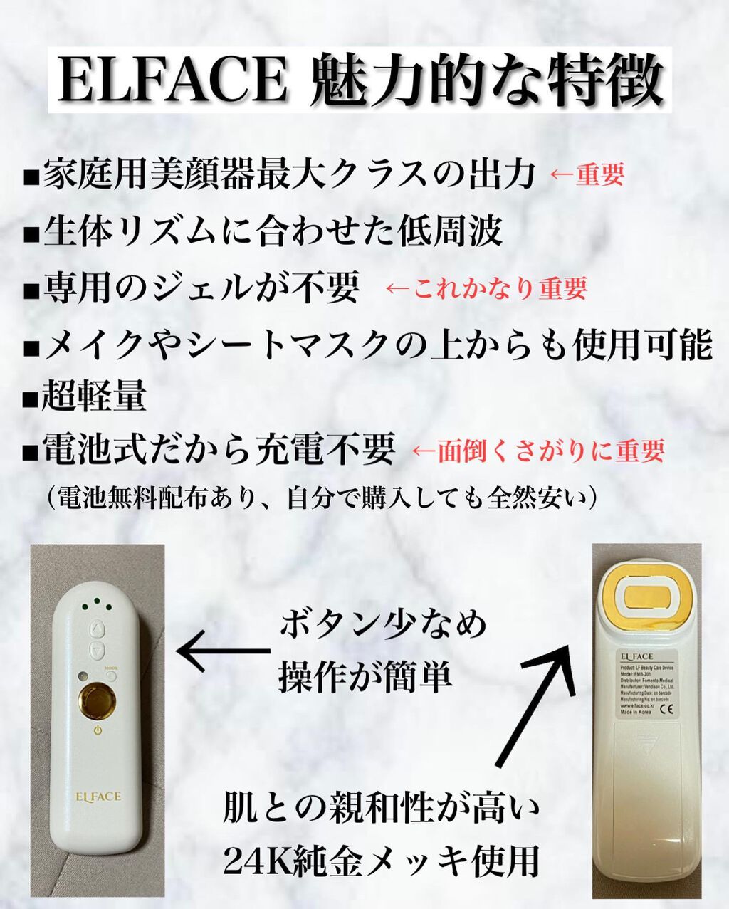 - 世界有数の美容大国の韓国でつくられた本格ホームケア美顔器。ジェルなどの塗布が不要でメイクの上からでも使用も可能。めぐりを円滑にし肌をなめらかにするLモード、肌のキメを整えハリを与えるSモードの2つのモードが搭載。肌と親和性の高い24金純金メッキ加工の電極から出る独自の低周波で、肌をキュッと引き締め、ハリと弾力のある肌へと導きます。
