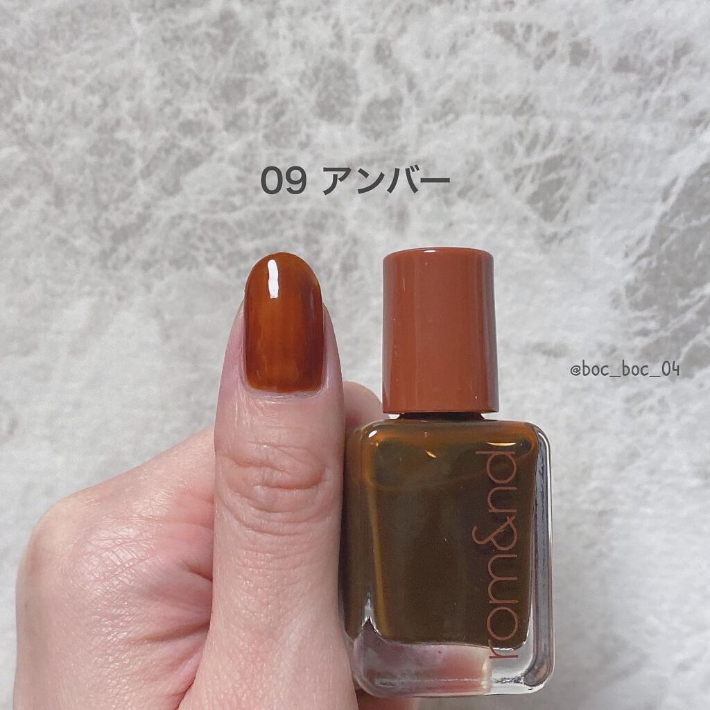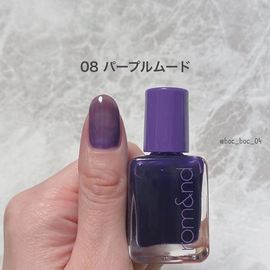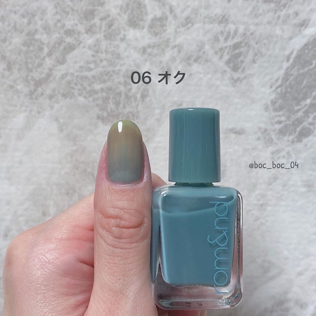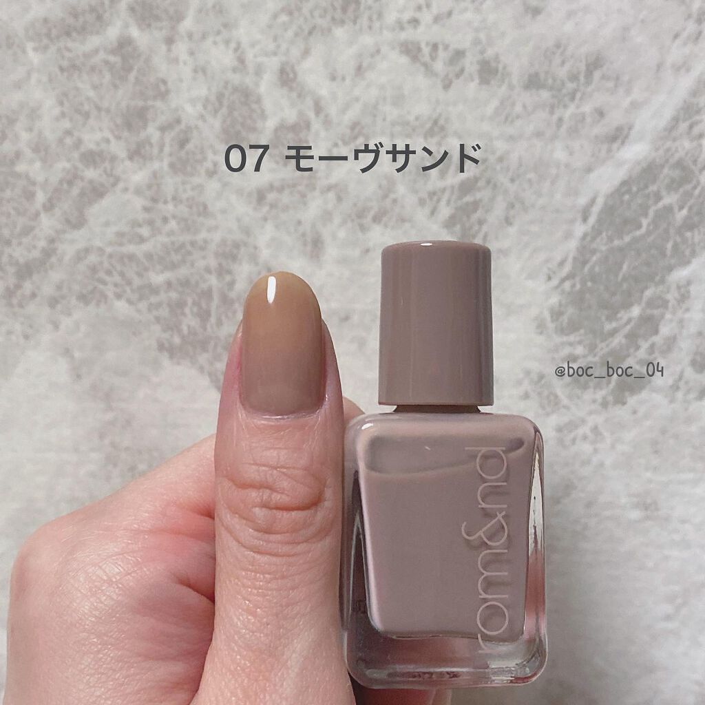 - 指先に玉石のような、ならかな光沢をとどめる。塗った瞬間から綺麗なツヤと光沢を維持し、重ねて塗っても透き通ったカラー感を鮮やかにとどめる、素早い乾燥力のナチュラルカラーネイル。「ロムアンド」の次世代型ネイルです。