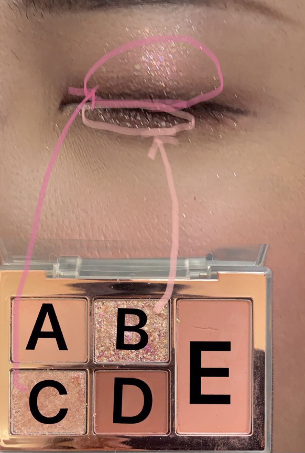 CLIOプロアイパレットのAの色を、アイホール全体に塗る。 Bの色をブラシに取って、目を開けた時に見えるくらいまで塗る。目を囲うようにして、下瞼にも塗る。 アイラインを引く。(ブラックブラウンがオススメ!) 3.のアイラインをぼかすようにして、Fの色を重ね塗りする。 さらに、4.の上から、グラデーションになるようにEの色を重ねる。 Cの色を指に取り、アイホール全体に薄く伸ばす。 Dの色を指に取り、黒目の上に塗る。 マジョリカマジョルカのシャドーカスタマイズを涙袋に塗る。 9.に薄くDの色を重ね塗りする。 cipicipiのグリッターイルミネーションライナーを、目頭に少しと、上瞼の黒目の上だけに少しのせる。