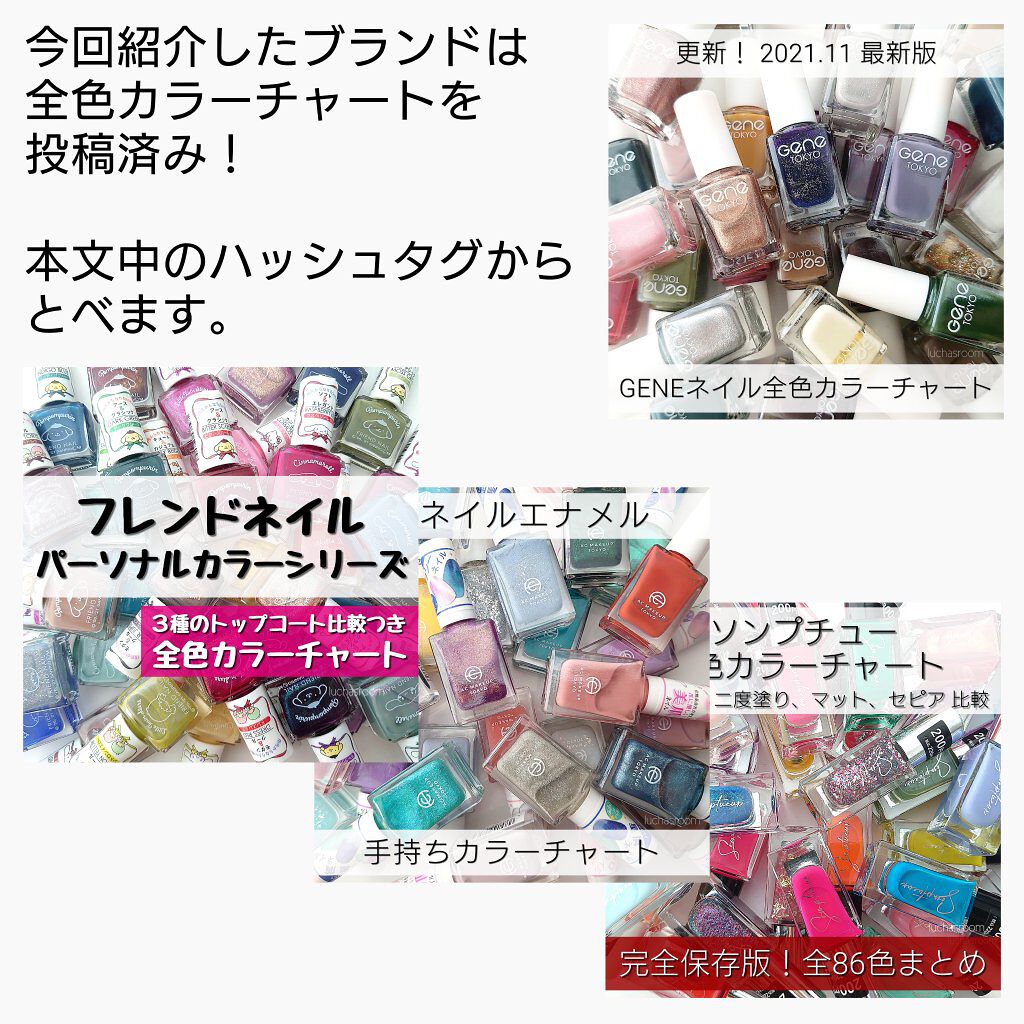 ⚠️更新版投稿しました⚠️こちらのハッシュタグからとべます▶#カラーチャートluchasroom完全保存版‼️ダイソーでネイルポリッシュを買うときに必携!ダイソーの3大ネイルポリッシュ、GENEネイル、フレンドネイル、ソンプチューの全色カラー...
