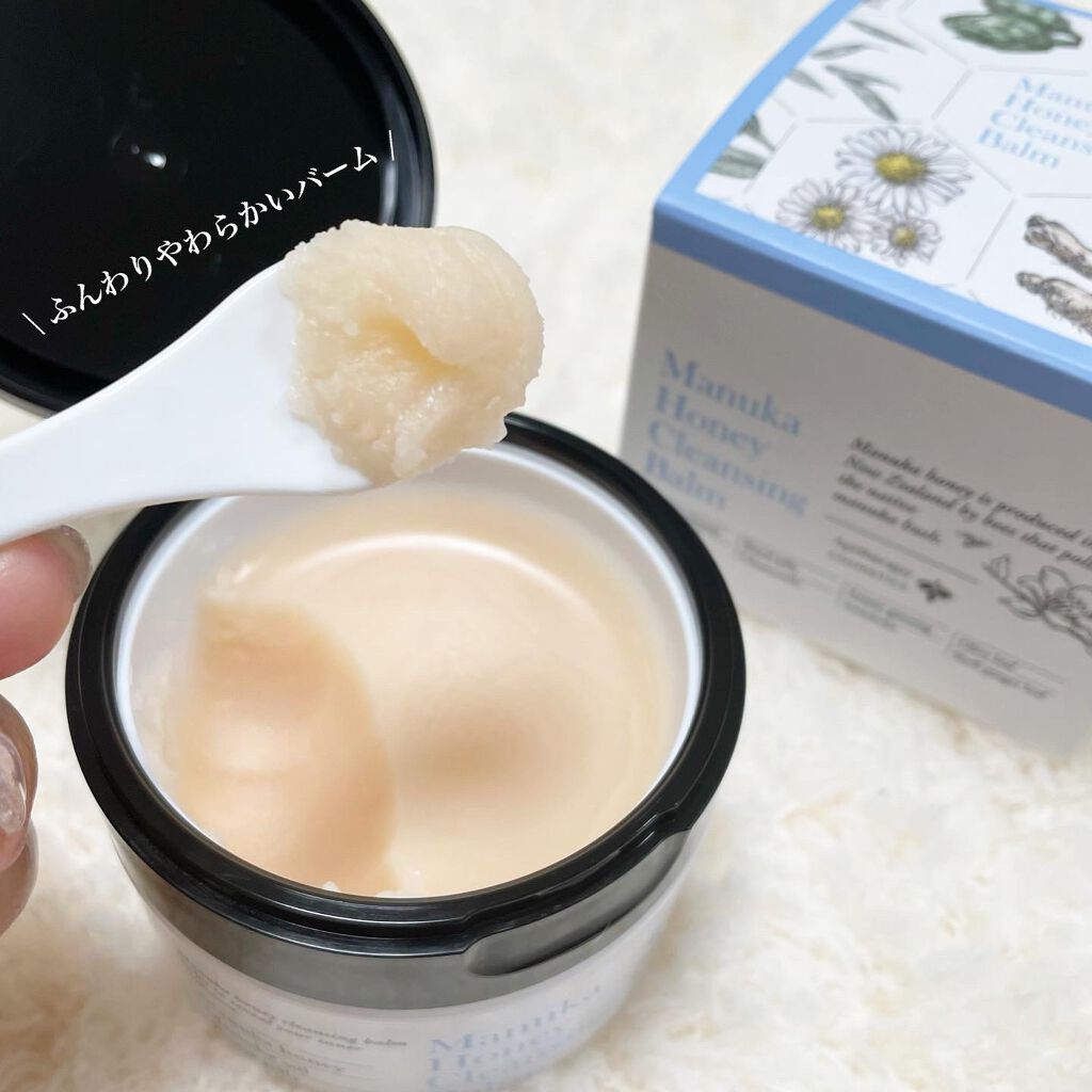 マヌカハニークレンジングバーム🍯.付属のスパチュラでバームを肌にのせて、肌温にとろりととろけるバームは、メイクの上でくるくるするとスルスルメイクと馴染む❤︎.マヌカハニーのおかげか、私は洗い上がりのしっとり感が感じられて満足🫶.抗菌成分を含む...