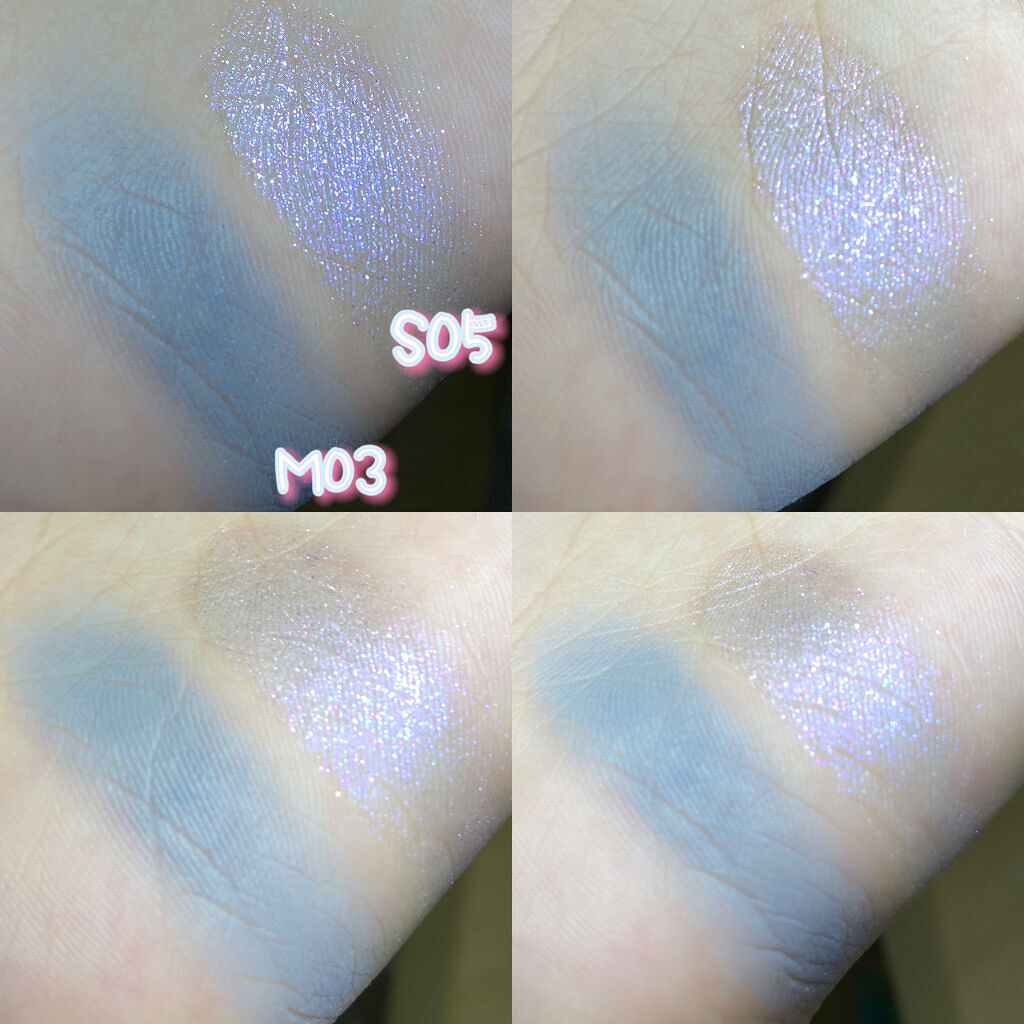 excel リアルクローズシャドウ CS04 プラムニット 青みくすみピンク! 小粒ラメ 密着感すごい!肌本来の艶感みたい 良い❣️ 下の2色は特に良い! 右上:ベース 左下:メインカラー 右下:アイライナー 左上:涙袋