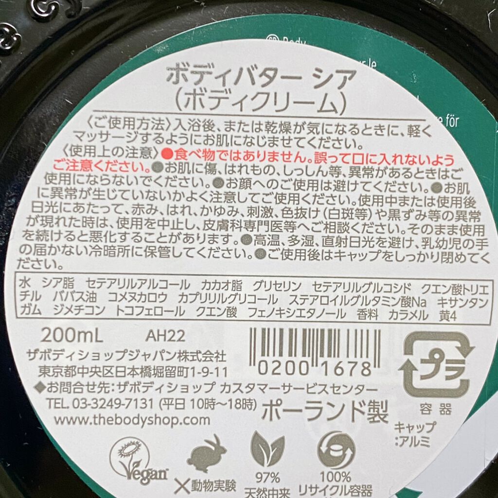 - <ボディクリーム> 97%自然由来成分配合で、格別にリッチでこっくりとしたバターのように溶ける、うるおうのにべたつきにくいテクスチャーの、シアバター(保湿成分)を配合したボディクリーム。肌を深いうるおいで満たし、しっとりやわらかな肌に導きます。 ほのかに甘く優しいシアの香りで、心なごみおだやかな気分に包まれます。 保湿成分シアバター・ババスオイル配合で、乾燥して固くなった肌をうるおいで満たし、やわらかくなめらかな肌を長時間保ちます。 <テスクチャー・仕上がり> ・格別にリッチでこっくりしたバターのような、体温でとろけるテクスチャー:エクストラリッチバター ・あと肌うっとりする保湿感 <お肌のタイプ> ベリードライスキン <シリーズ特徴>※ボディバター全種類に共通しております ー独自のバターテクスチャーで、長時間うるおいを感じる肌へー すべてのボディバターに、コミュニティフェアトレードの保湿成分シアバターを配合し、長時間うるおいをキープ。 ーヴィーガン認証ー ヴィーガン認証の代表的な存在であるヴィーガン協会から認証を受けた動物にも配慮した商品です。 ーパッケージー 100%リサイクル可能な容器は、インドのプラスチックフォーチェンジ社のコミュニティフェアトレード再生プラスチックを使用。アルミの蓋も100%リサイクル可能となっており、よりサステナブルなパッケージに進化しました。