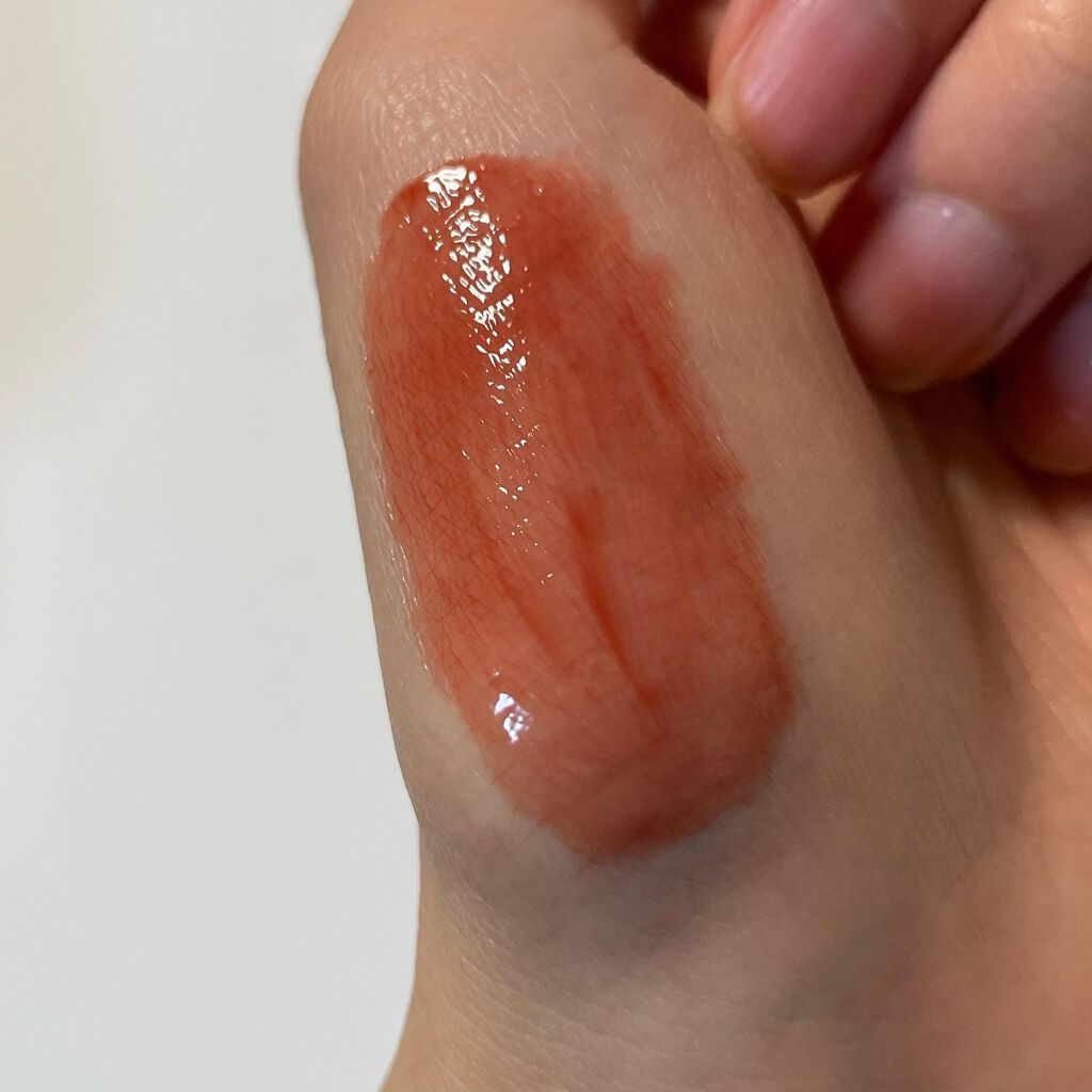 キラッとした濡れツヤ感のある仕上がりで、角度を変えるとキラキラしてとても綺麗です🙏✨ ウォータリーにとろみも混じったテクスチャー。一度につく量が少量で、薄ーくしかつかないため唇に負担を感じません✨ 発色は1度塗りでもかなりきちんとカラーがついてくれます!重ねるほど発色もほんのりカラーの深みが出る印象です🙌 ティッシュオフしてみたところカラーの固定力は結構高いイメージでしたが、食事をするとほんのりと色味が残るかなといった印象です。 乾燥はしにくいですが、ベースにリップクリームなど何もぬらずにつけた時に若干の乾燥を感じたので、きちんと保湿してからつけるのがベストかと思います💡 二等辺三角形のやや平ためのアプリケーター。先端がとんがっていて唇のラインに当てやすいです🌟 りんごのヨーグルトみたいな爽やかで甘い香りがします🍎唇につけている瞬間は香りますが、生活している分には味がしたり気になることはありません🙌