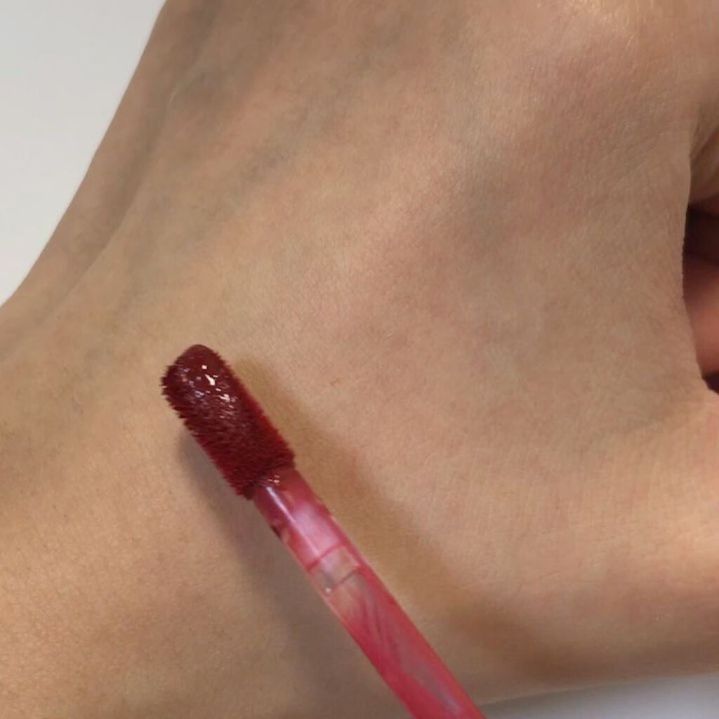 キラッとした濡れツヤ感のある仕上がりで、角度を変えるとキラキラしてとても綺麗です🙏✨ ウォータリーにとろみも混じったテクスチャー。一度につく量が少量で、薄ーくしかつかないため唇に負担を感じません✨ 発色は1度塗りでもかなりきちんとカラーがついてくれます!重ねるほど発色もほんのりカラーの深みが出る印象です🙌 ティッシュオフしてみたところカラーの固定力は結構高いイメージでしたが、食事をするとほんのりと色味が残るかなといった印象です。 乾燥はしにくいですが、ベースにリップクリームなど何もぬらずにつけた時に若干の乾燥を感じたので、きちんと保湿してからつけるのがベストかと思います💡 二等辺三角形のやや平ためのアプリケーター。先端がとんがっていて唇のラインに当てやすいです🌟 りんごのヨーグルトみたいな爽やかで甘い香りがします🍎唇につけている瞬間は香りますが、生活している分には味がしたり気になることはありません🙌