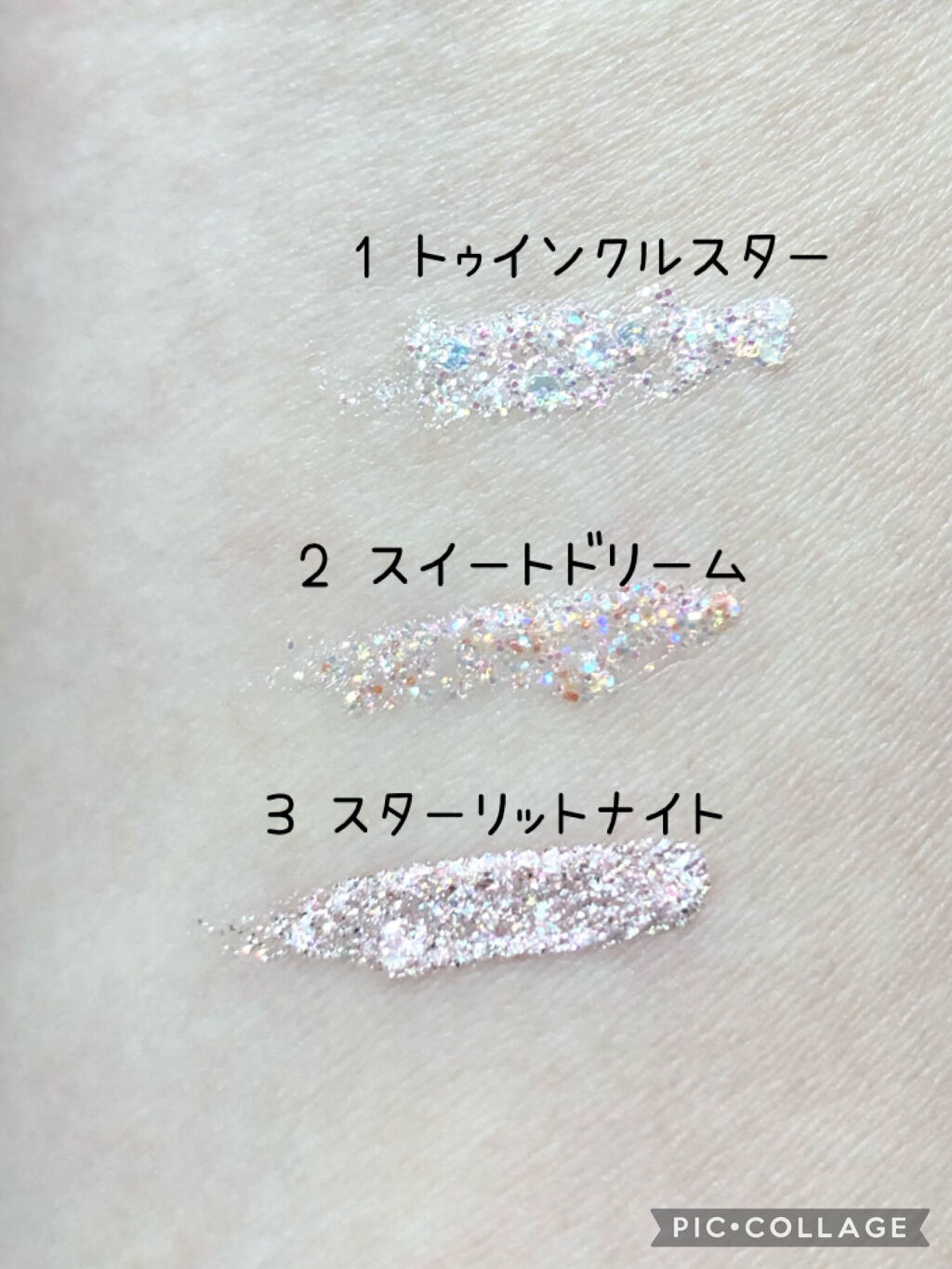 - リアルジュエリーパウダー配合でさらに神秘的で多彩な輝きを演出。 ウォーターベースでなめらかに目元に密着・すっきり長持ち。 ◇01 トゥインクルスター ピュアなホワイトベースにグリーン&オレンジのカラーが神秘的に輝くラメグリッター。 ◇02 スイートドリーム 愛らしいピンクをベースにブルー&コーラルのラメ, オレンジの6角グリッターが輝きます。 ◇03 スターリットナイト 夜空に輝く天の川の様なシルバー、ゴールドのラメを組み合わせたシャンパン系のカラー。