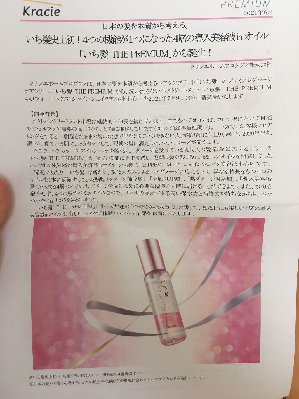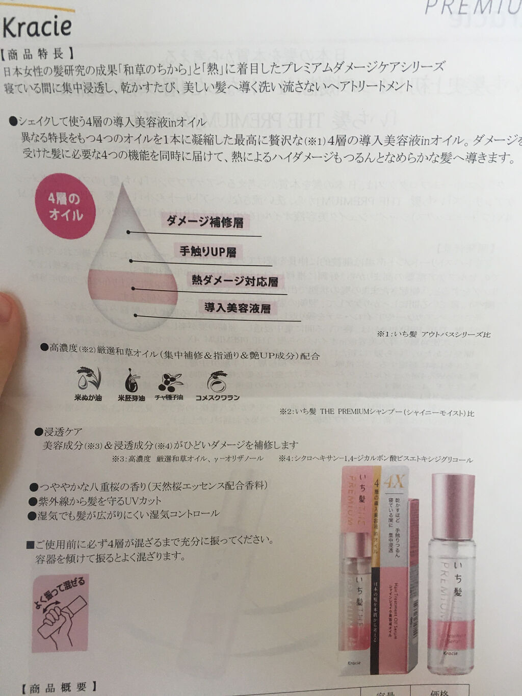 - 日本女性の髪研究の成果「和草のちから」と「熱」に着目したプレミアムダメージケアシリーズ 寝ている間に集中浸透し、乾かすたび、美しい髪へ導く洗い流さないヘアトリートメント ●シェイクして使う4層の導入美容液inオイル 異なる特長をもつ4つのオイルを1本に凝縮した最高に贅沢な(※1)4層【ダメージ補修層/手触りUP層/熱ダメージ対応層/導入美容液層】の導入美容液inオイル。 ダメージを受けた髪に必要な4つの機能を同時に届けて、熱によるハイダメージもつるんとなめらかな髪へ導きます。 ※1:いち髪 アウトバスシリーズ比